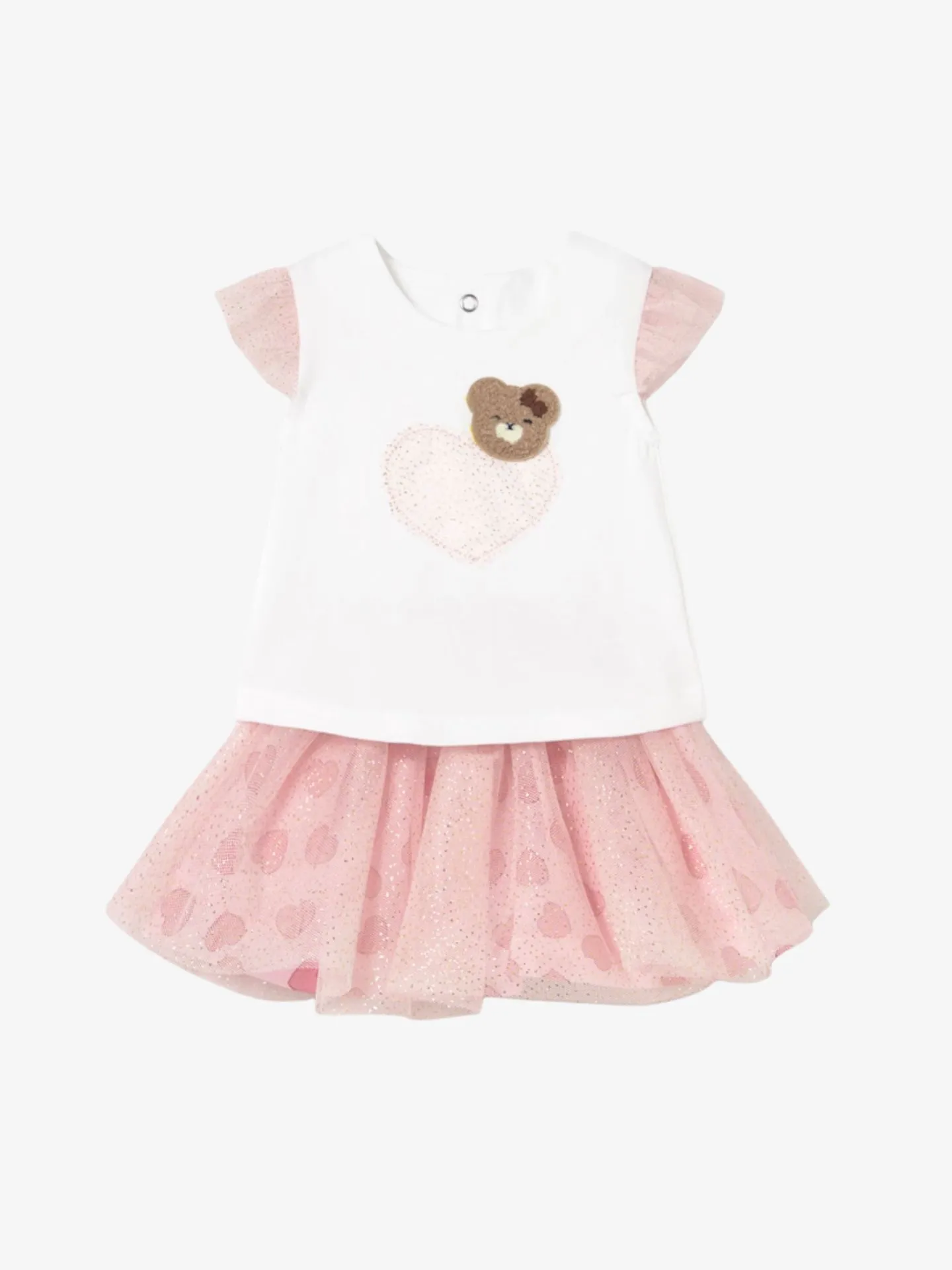 De Mayoral set bestaat uit een tulle rok en een bijpassend t-shirt met tulle mouwtjes, knoopsluiting op de rug en een hartje en berenembleem. Het tulle heeft glittertjes.