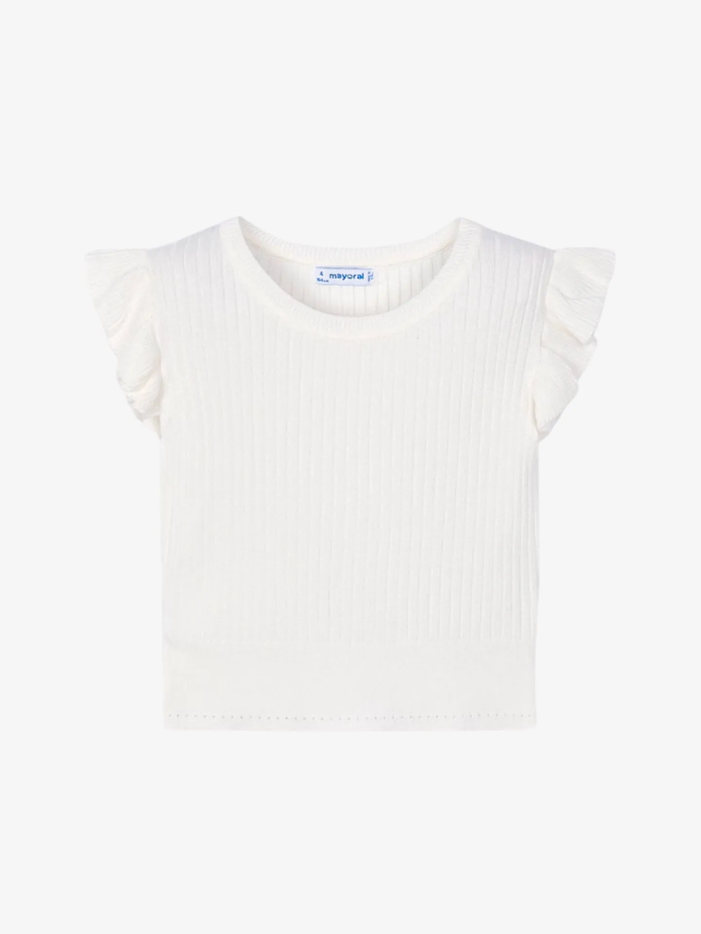 Mayoral meisje rib shirt van zacht viscose materiaal in de kleur Wit met roezels mouwen. Het rib shirt heeft een ronde hals en mouwen met ruches.