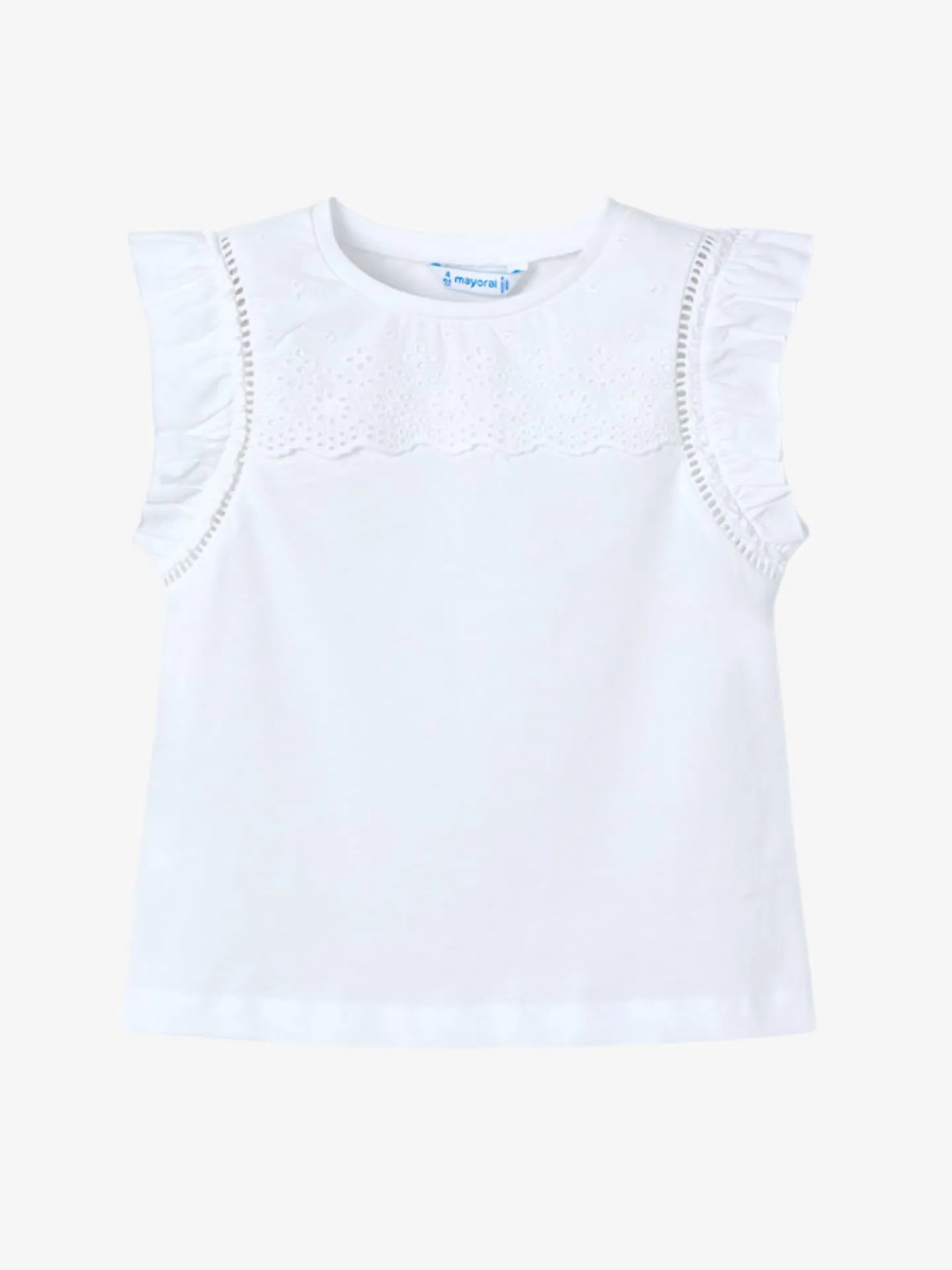 Het Mayoral meisjes T-shirt in de kleur wit met ruches mouwen heeft een ronde hals en broderie aan de voorzijde. Combineer met een rokje of spijkerbroek.
