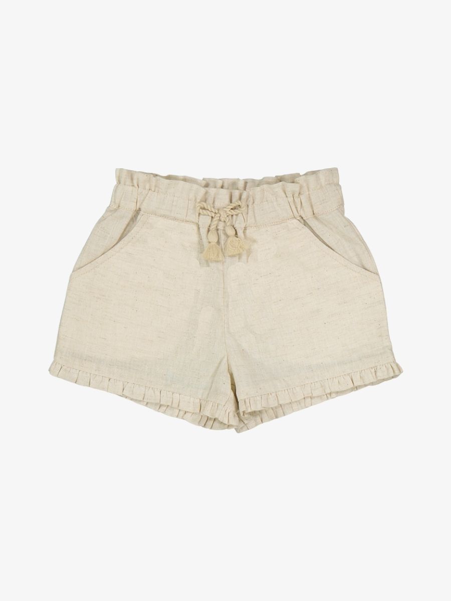 De Mayoral Linen Ruffle Short heeft een elastieke tailleband met kwastjes, steekzakken en roezels aan de onderkant. De short heeft een linnen kwaliteit.