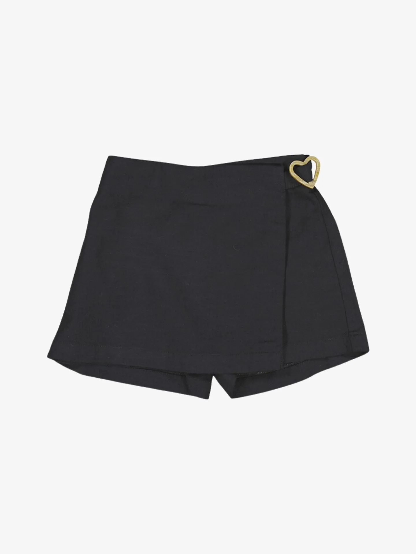 De Mayoral Skort in de kleur Zwart heeft een elastische tailleband, een asymmetrische look met overslag en een hartjes detail. Combineer met de bijpassende shirts.