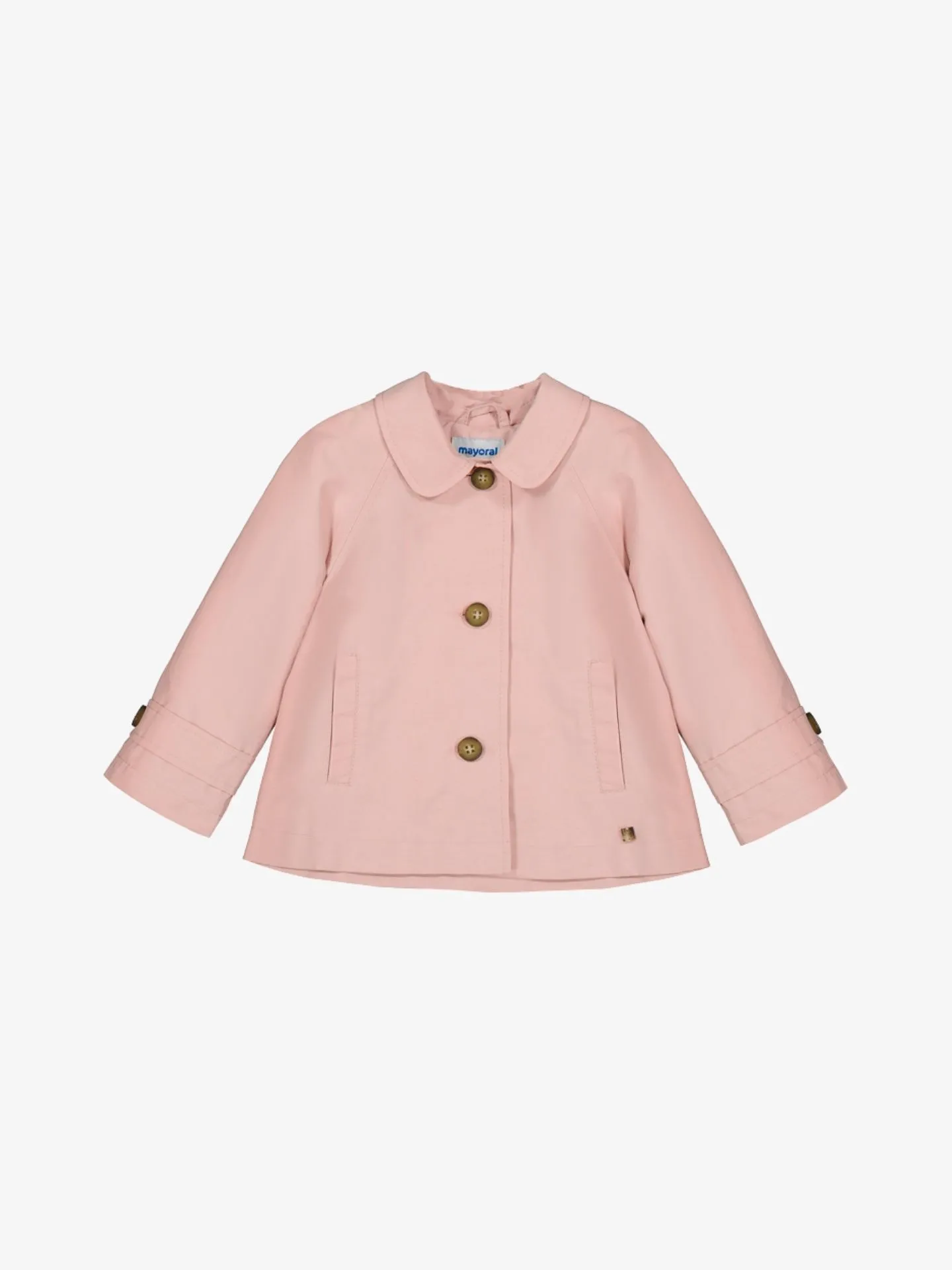 Trenchcoat van het Spaanse merk Mayoral. De trenchcoat heeft een knoopsluiting, platte kraag, steekzakken en een klein metalen logo aan de linker onderzijde.
