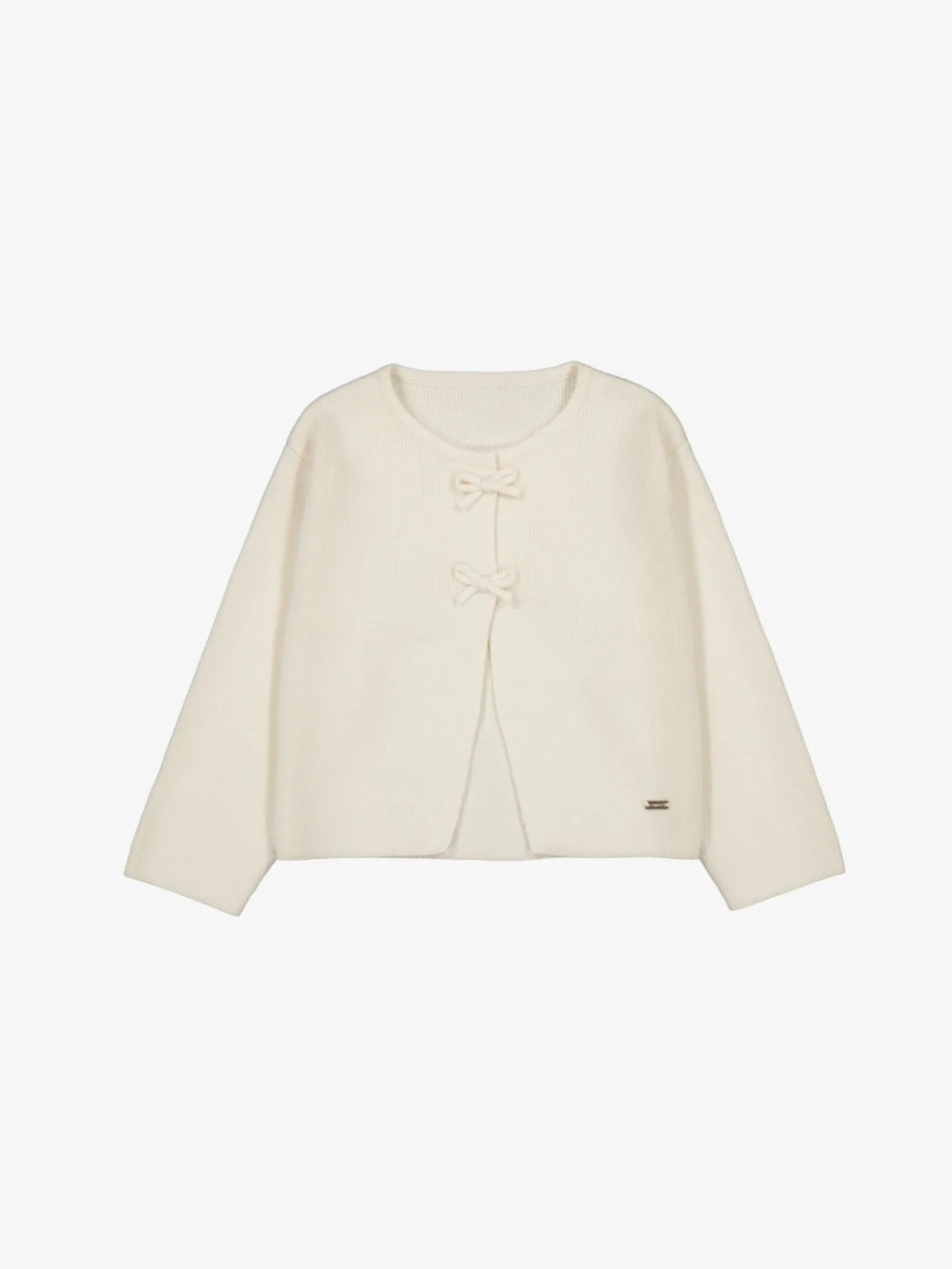 Rib vestje van het Spaanse merk Mayoral. Het vestje heeft een ronde hals, lange mouwen, metalen logo en strikjes op de drukknoopsluiting aan de voorzijde.