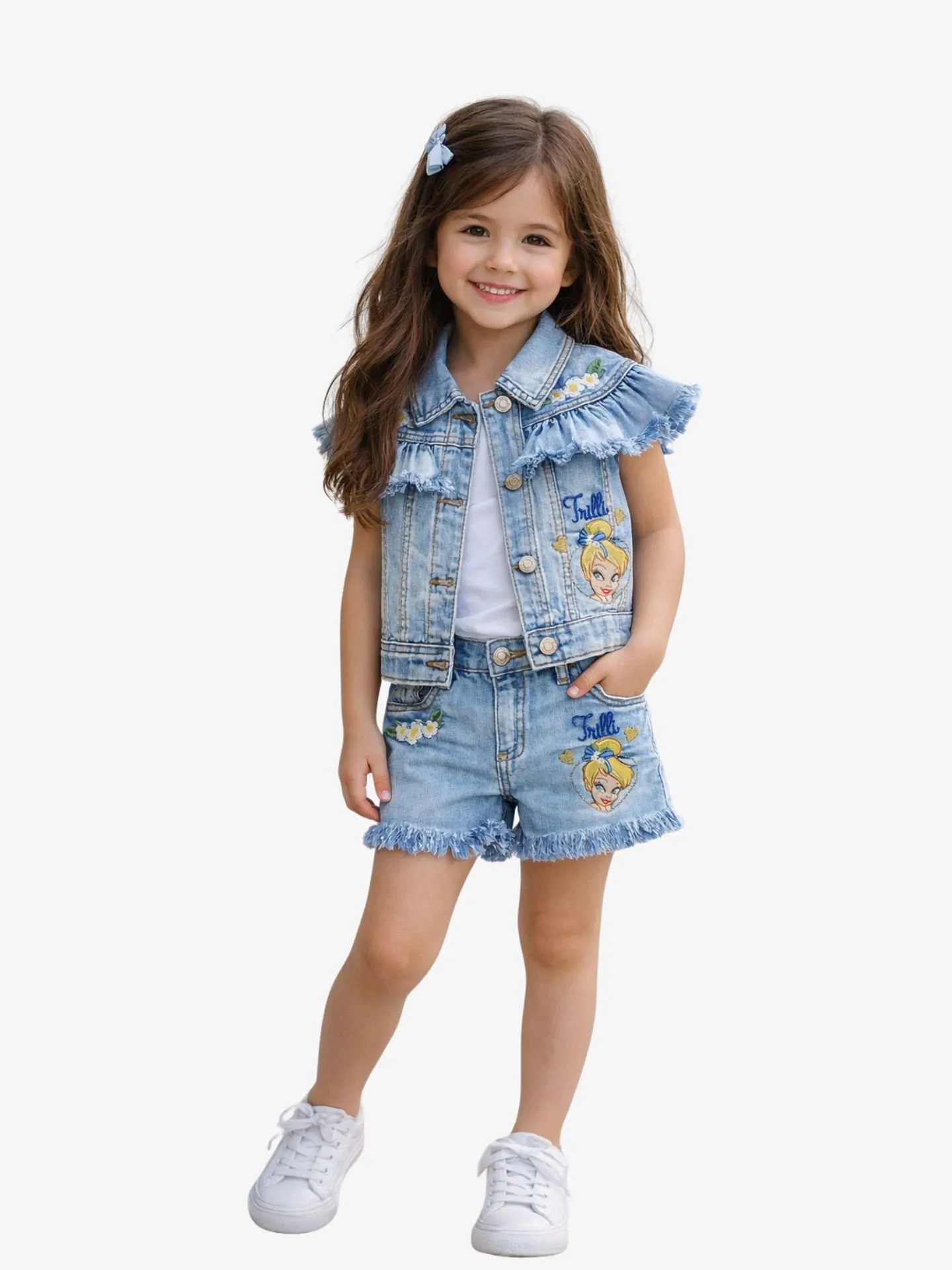 Denim gilet van het Italiaanse merk Monnalisa. De mouwloze spijkergilet in de kleur Denim bleach heeft een knoopsluiting, sierborduursels en een roezel met gerafelde randjes.
