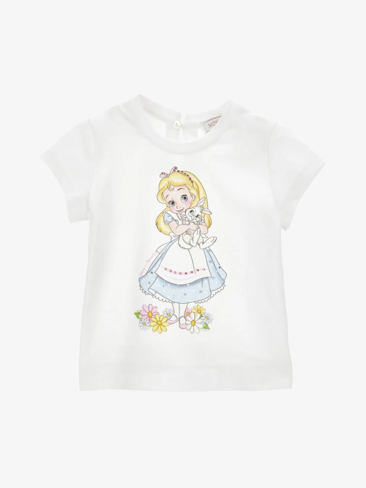 Het Monnalisa T-shirt in de kleur Bianco uit de Alice in Wonderland collectie heeft een knoopsluiting op de rug. De print heeft strass stenen. Combineer met de bijpassende rok.