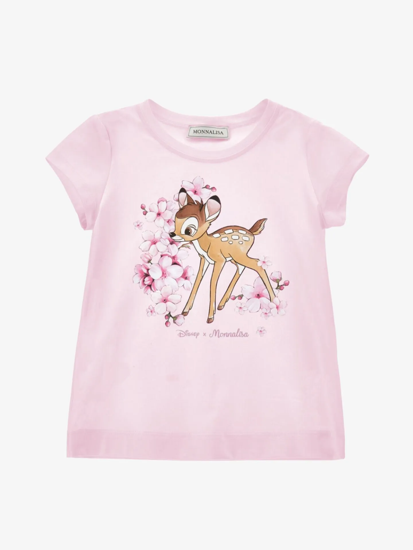 Het Monnalisa T-shirt in de kleur Rosa Fairytale uit de Bambi collectie heeft een print aan de voorkant met Bambi en bloemen. Combineer het shirt met de bijpassende rok of shorts.