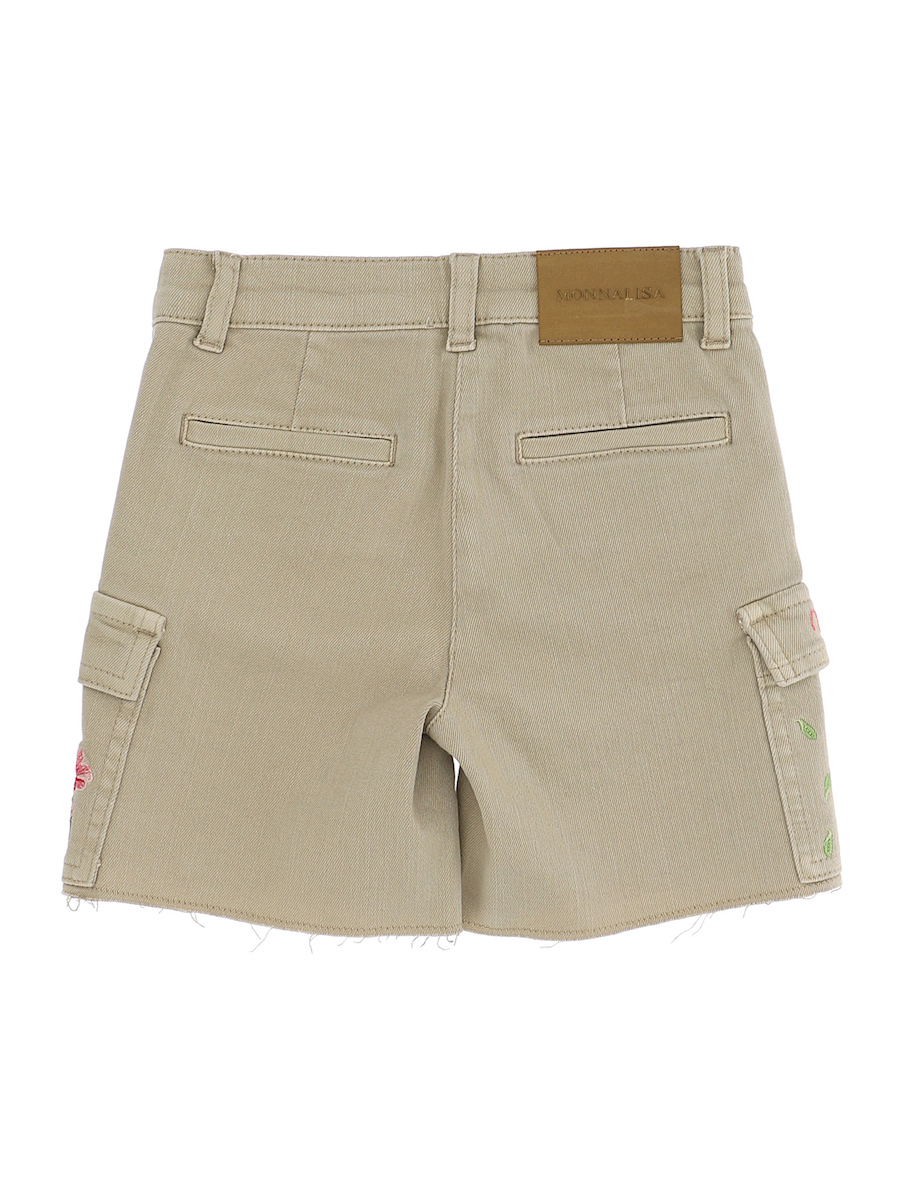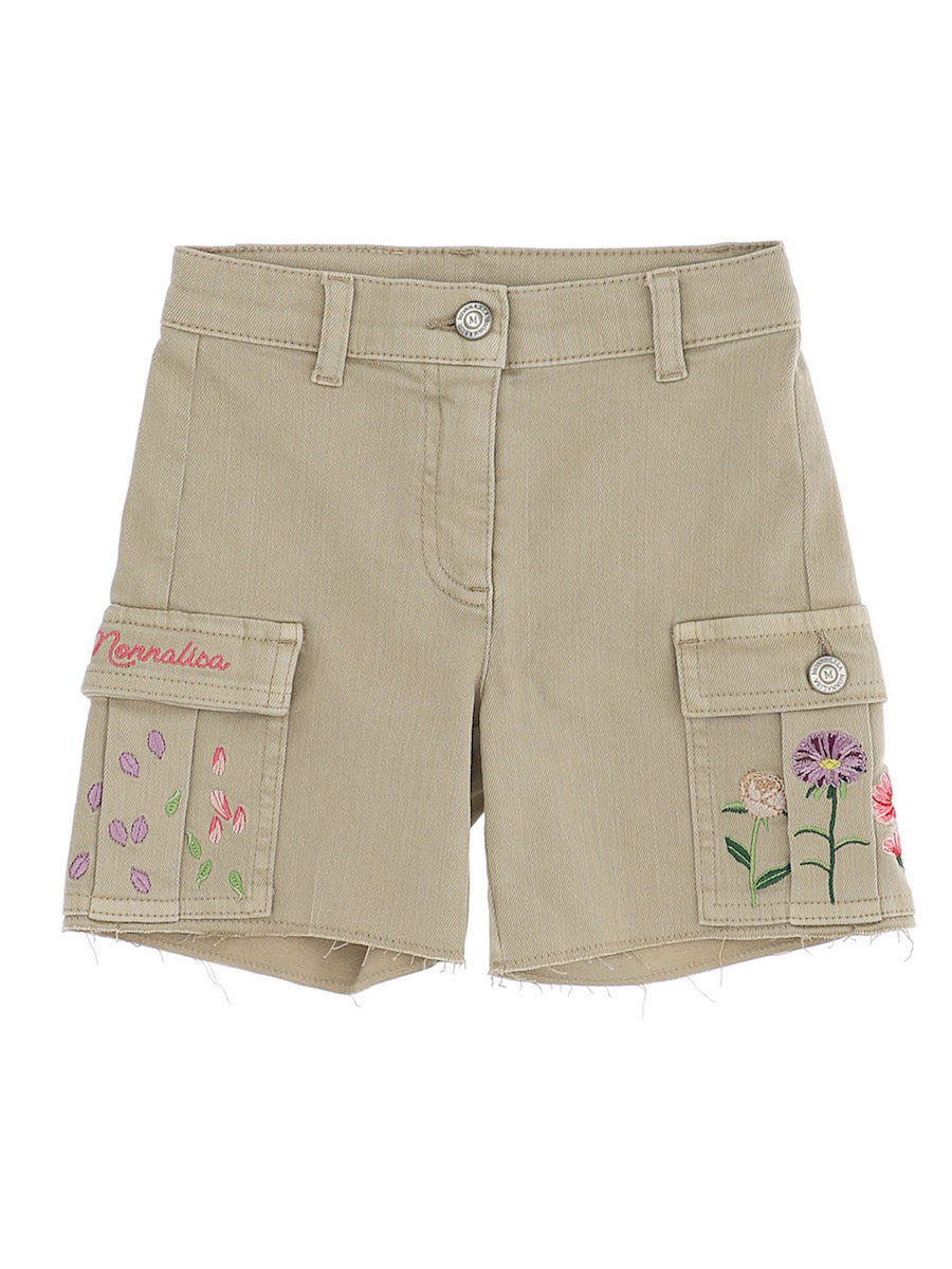 Deze short is gemaakt van katoen boor en sluit doormiddel van een knoop. De short heeft riemlussen en symmetrische geborduurde zakken. Ook zitten er 2 zakken aan de achterkant. Monnalisa kinderkleding, Monnalisa kids sale, Monnalisa sale