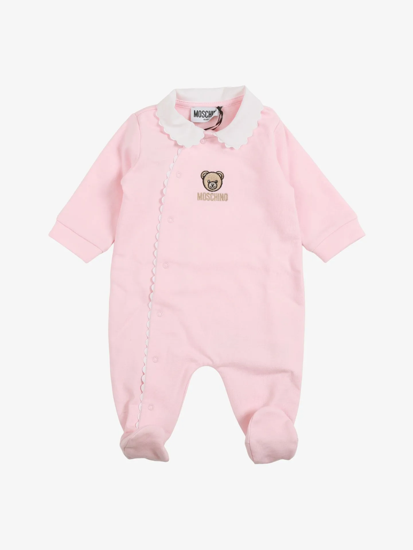 Het Moschino baby boxpakje in de kleur Sugar Rose heeft een schulprandkraag, schuine drukknoopsluiting aan de voorzijde, voetjes en een geborduurd merk logo aan de voorzijde.