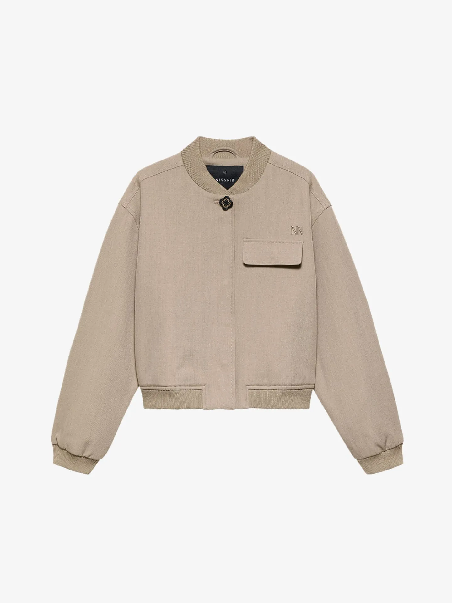 De NikNik Luci Jack met een dikke stof, een ronde hals, elastische tailleband en een drukknoopsluiting. Het jack is voorzien van geribde boorden en een knoopdetail.