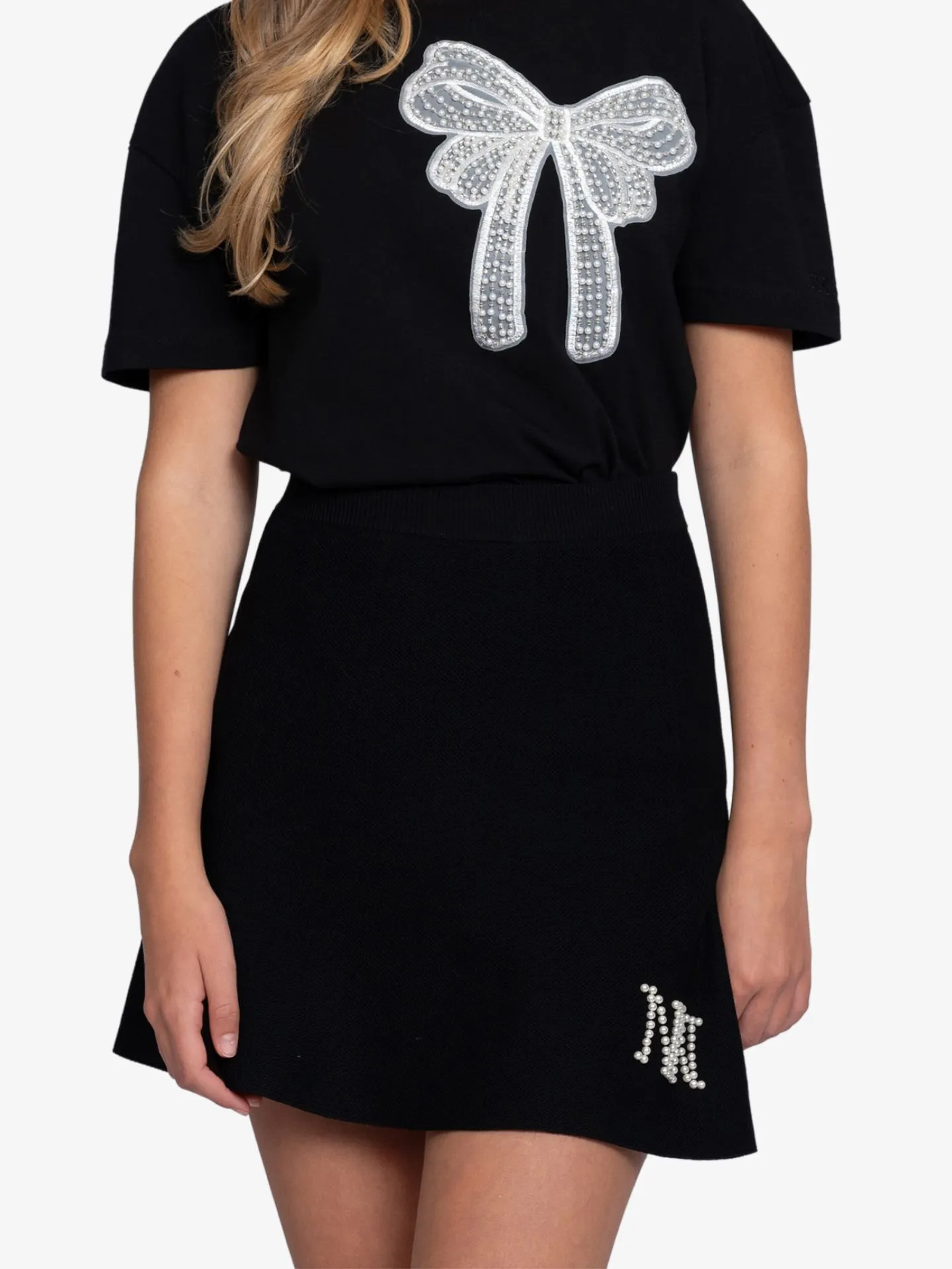 Fijngebreide midi rok met een logo gemaakt van parels, een elastische tailleband en een normale pasvorm. Combineer de rok samen met het bijpassende t-shirt.