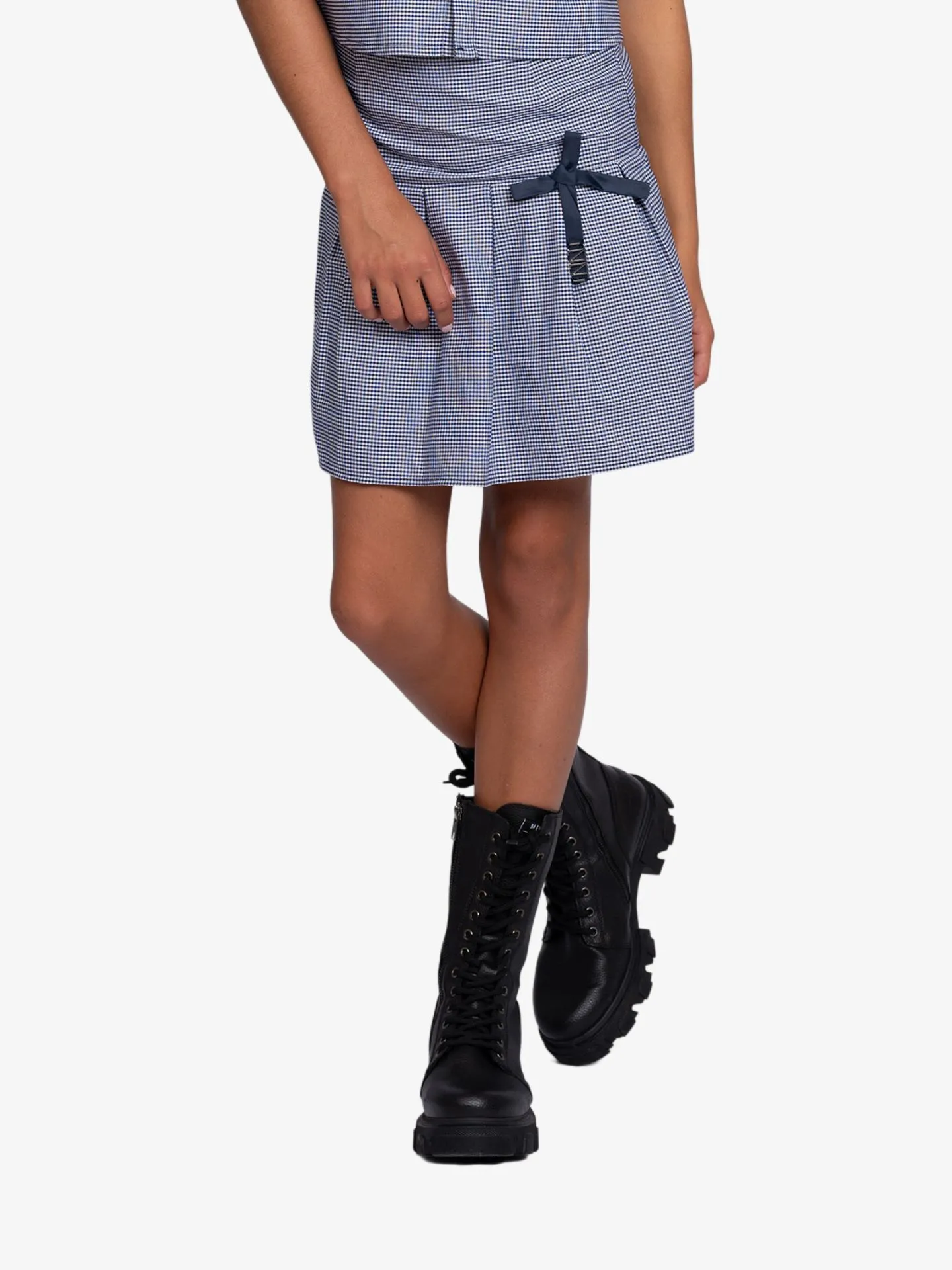 Geplooide rok met geruit patroon, een strik detail en een hoge taille. De rok is voorzien van een ritssluiting op de achterkant met een elastisch stuk.
