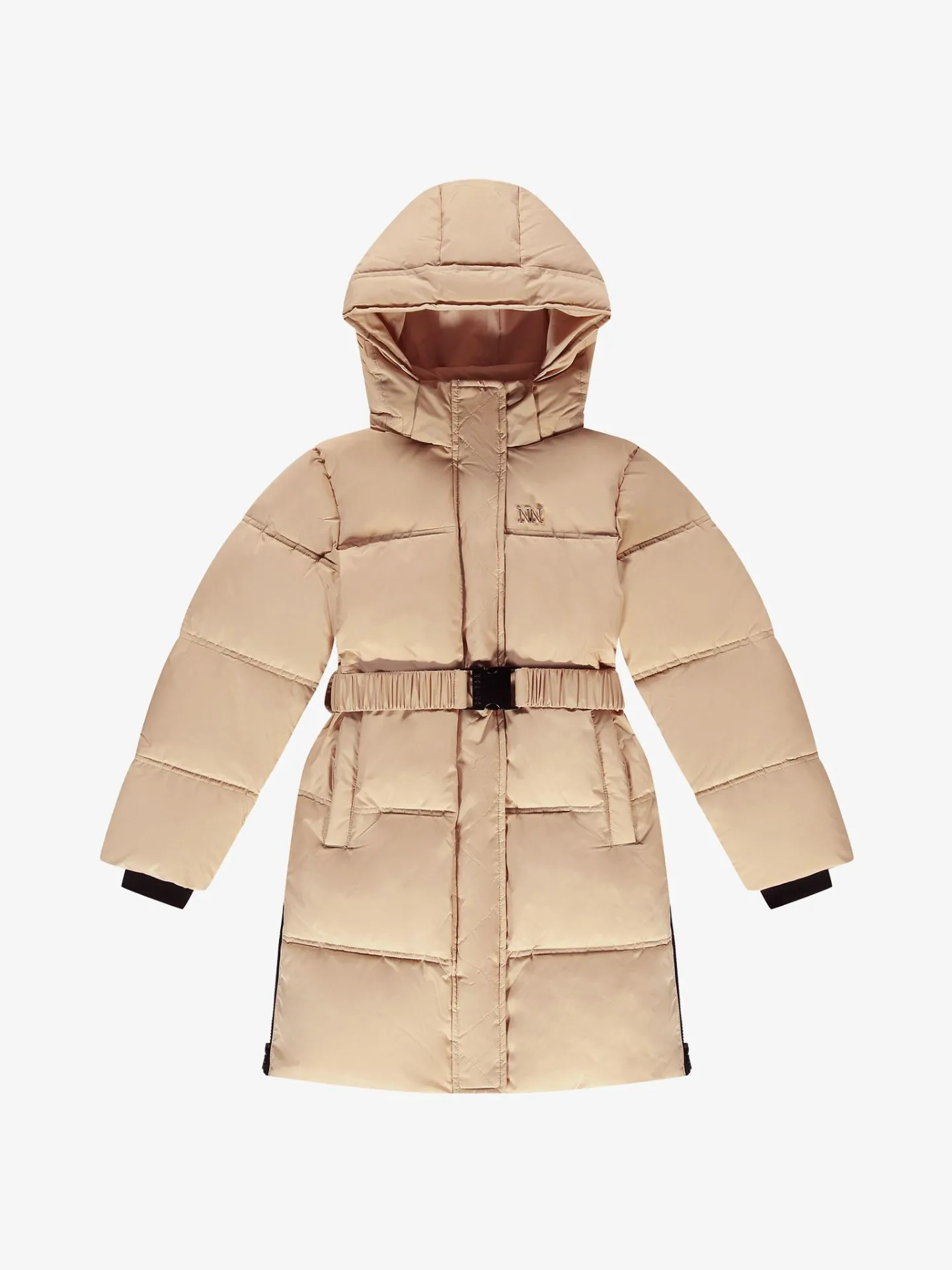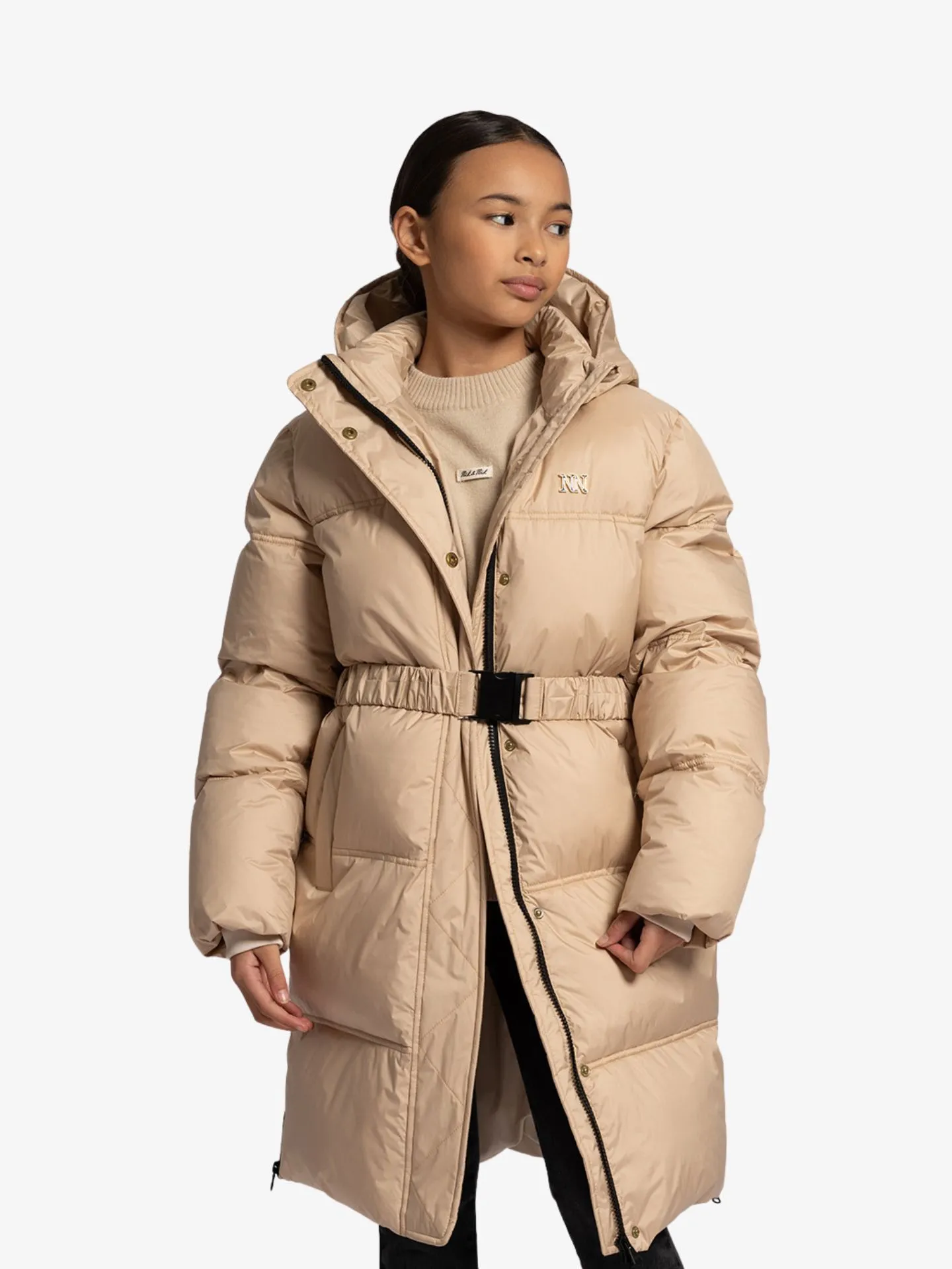 Lange gewatteerde pufferjas met een elastische riem, een capuchon en een NN-logo. De jas is voorzien van een ritssluiting en drukknopen, zakken en ritsen onderaan de zijkanten.
