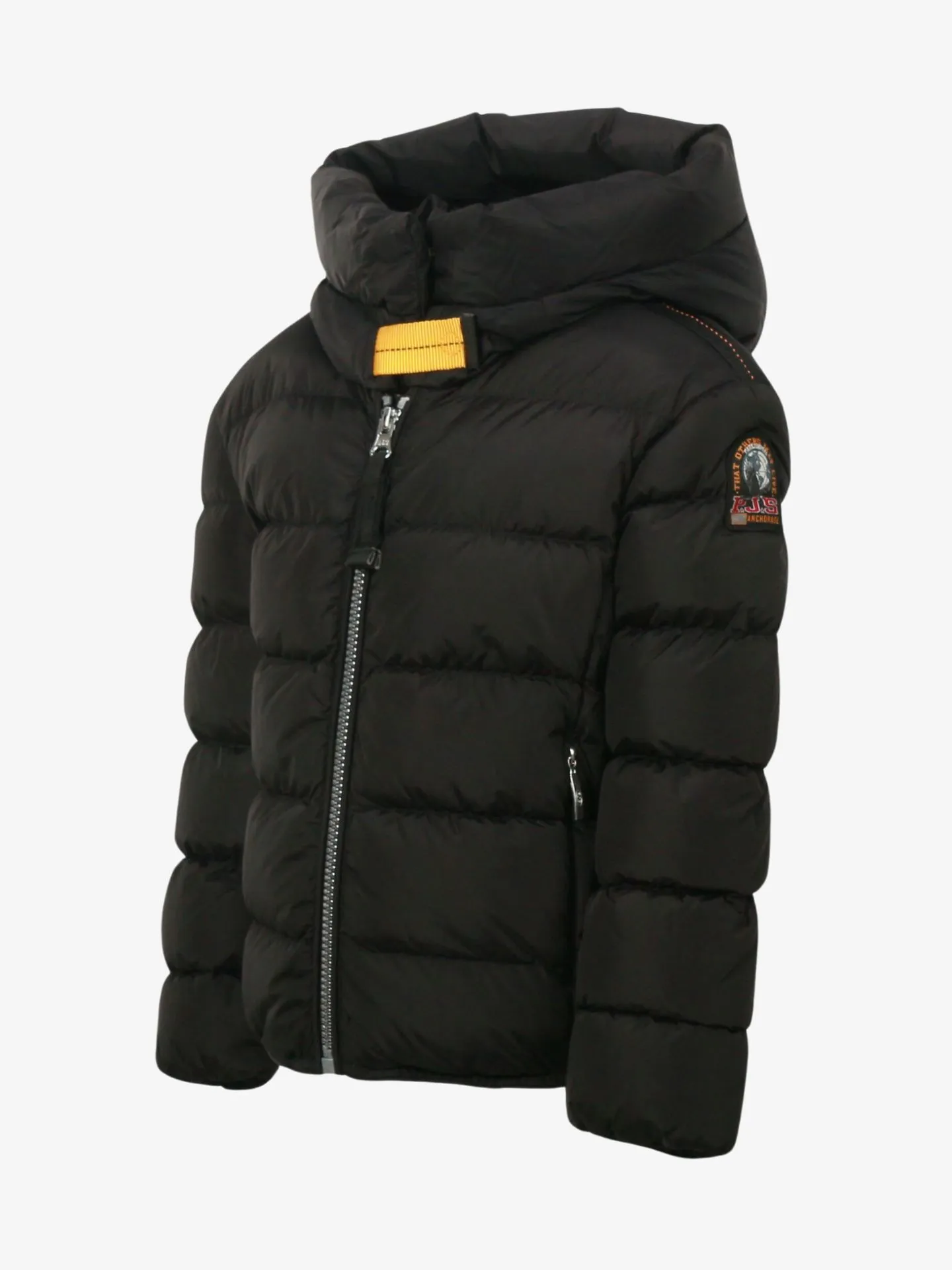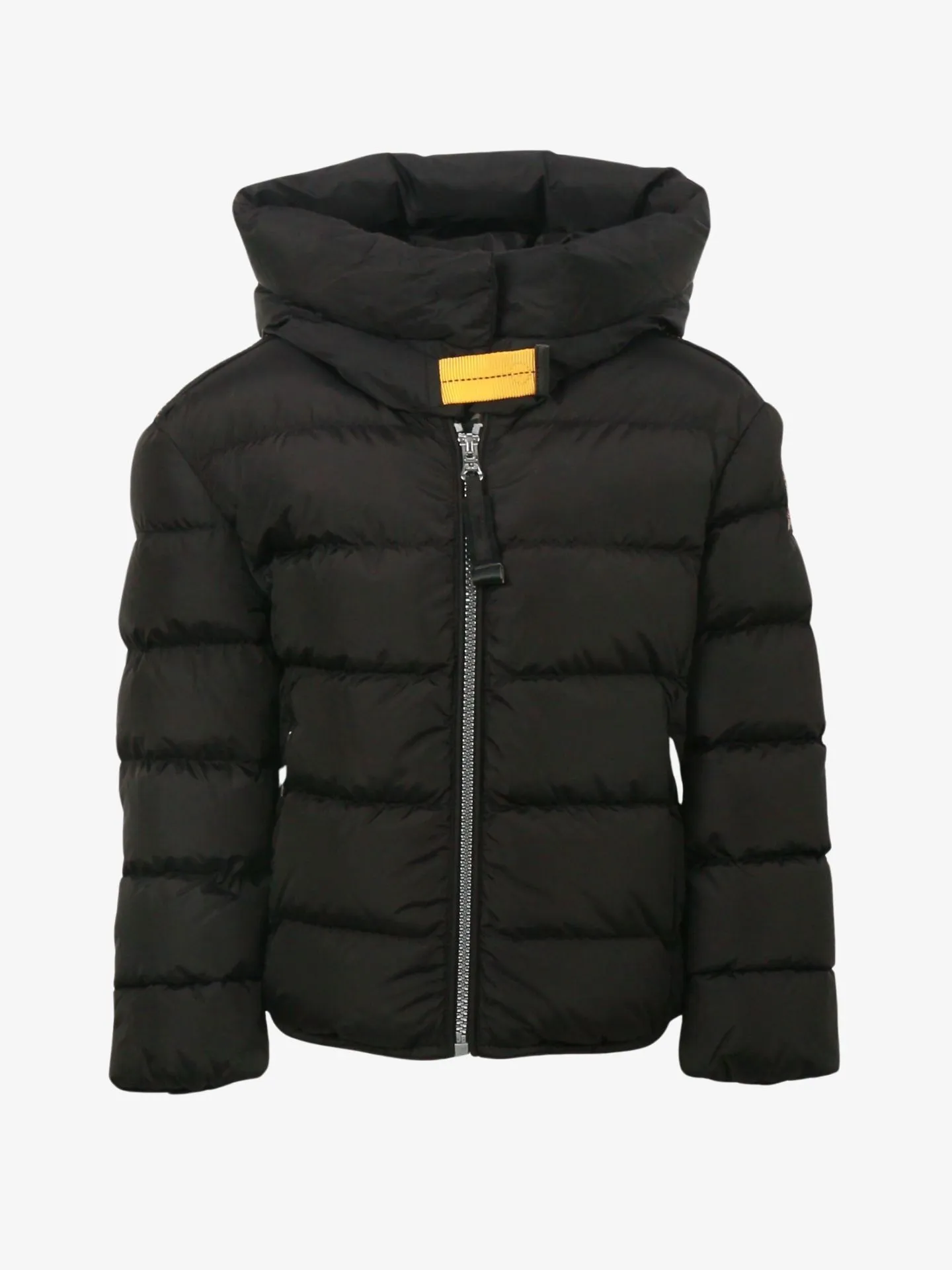 De Parajumpers Kids Jinny winterjas in zwart heeft een matte afwerking. De jas heeft een zilverkleurige ritssluiting, zakken met ritsen, het bekende gele Parajumpers label en een logo embleem op de mouw.