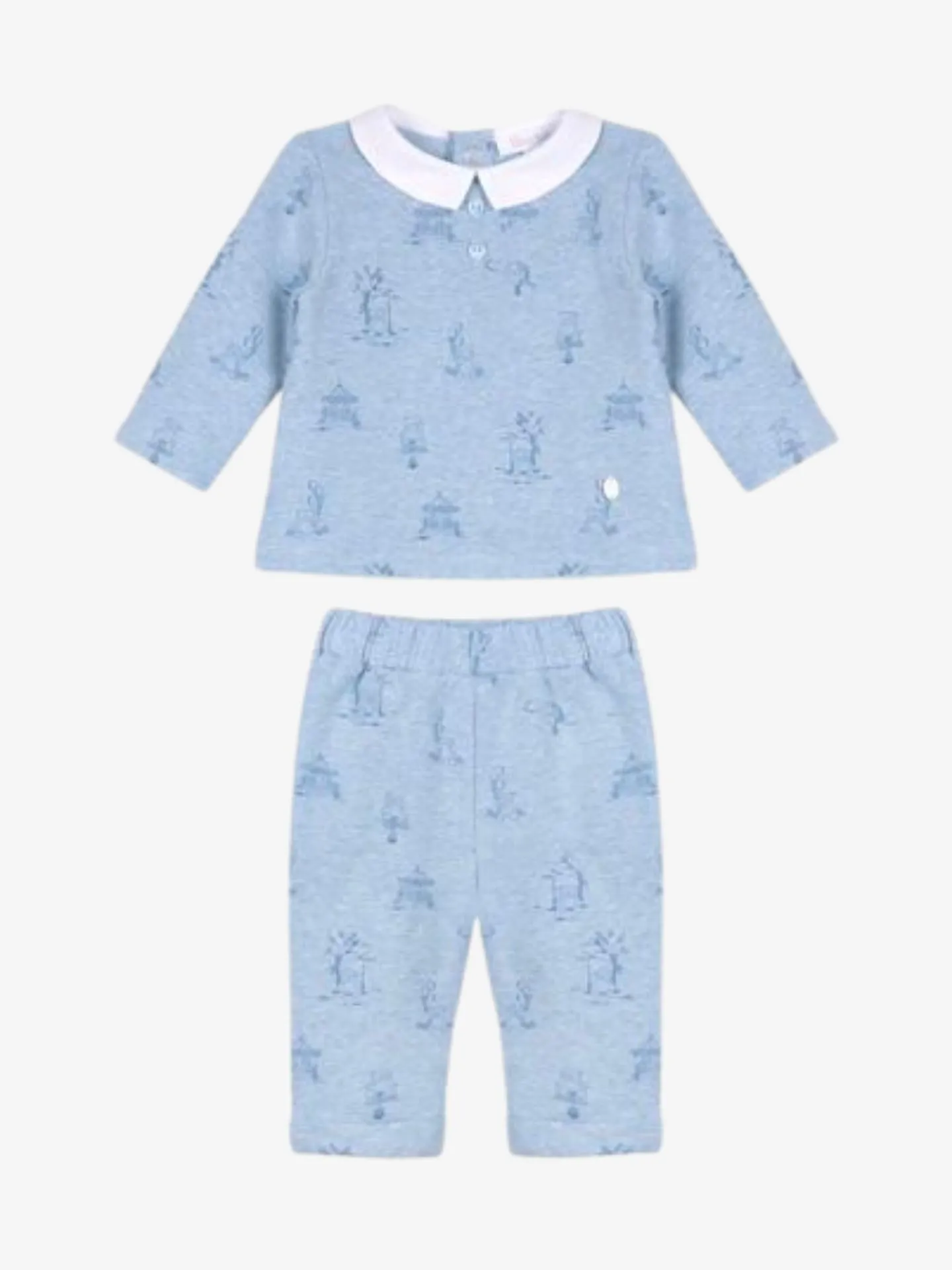Prachtige blauwe Toile du Joy-set met een fleece top met een contrasterende jersey kraag en een bijpassende fleece broek. Comfortabel en zacht voor een comfortabele nachtrust.