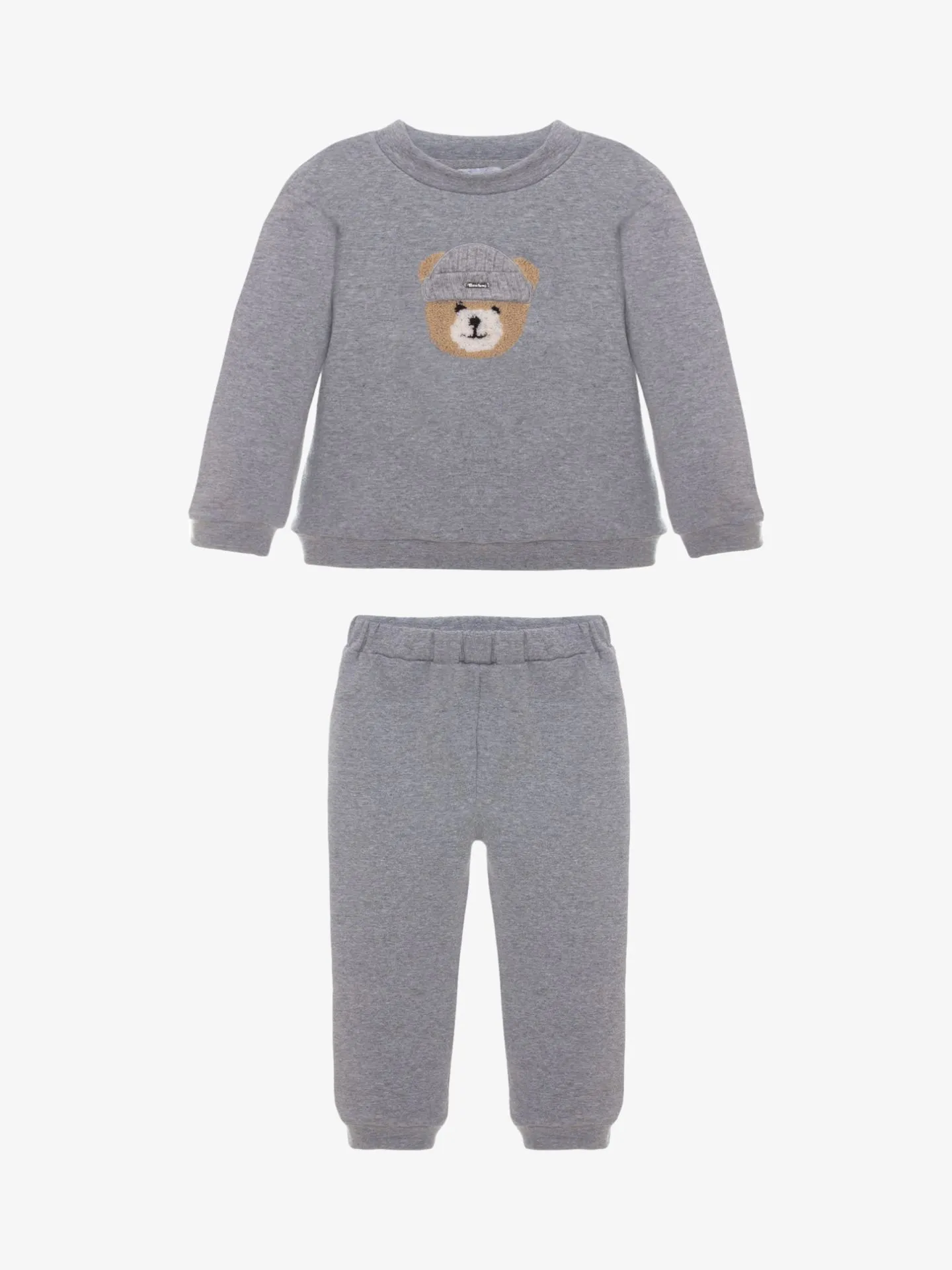 Deze comfortabele grijze tweedelige set is gemaakt van zacht katoenfleece. De sweater met lange mouwen heeft een schattige geborduurde teddybeer met een muts op de borst. De set wordt compleet gemaakt met een comfortabele bijpassende broek met elastische tailleband, perfect om in te loungen of te spelen.