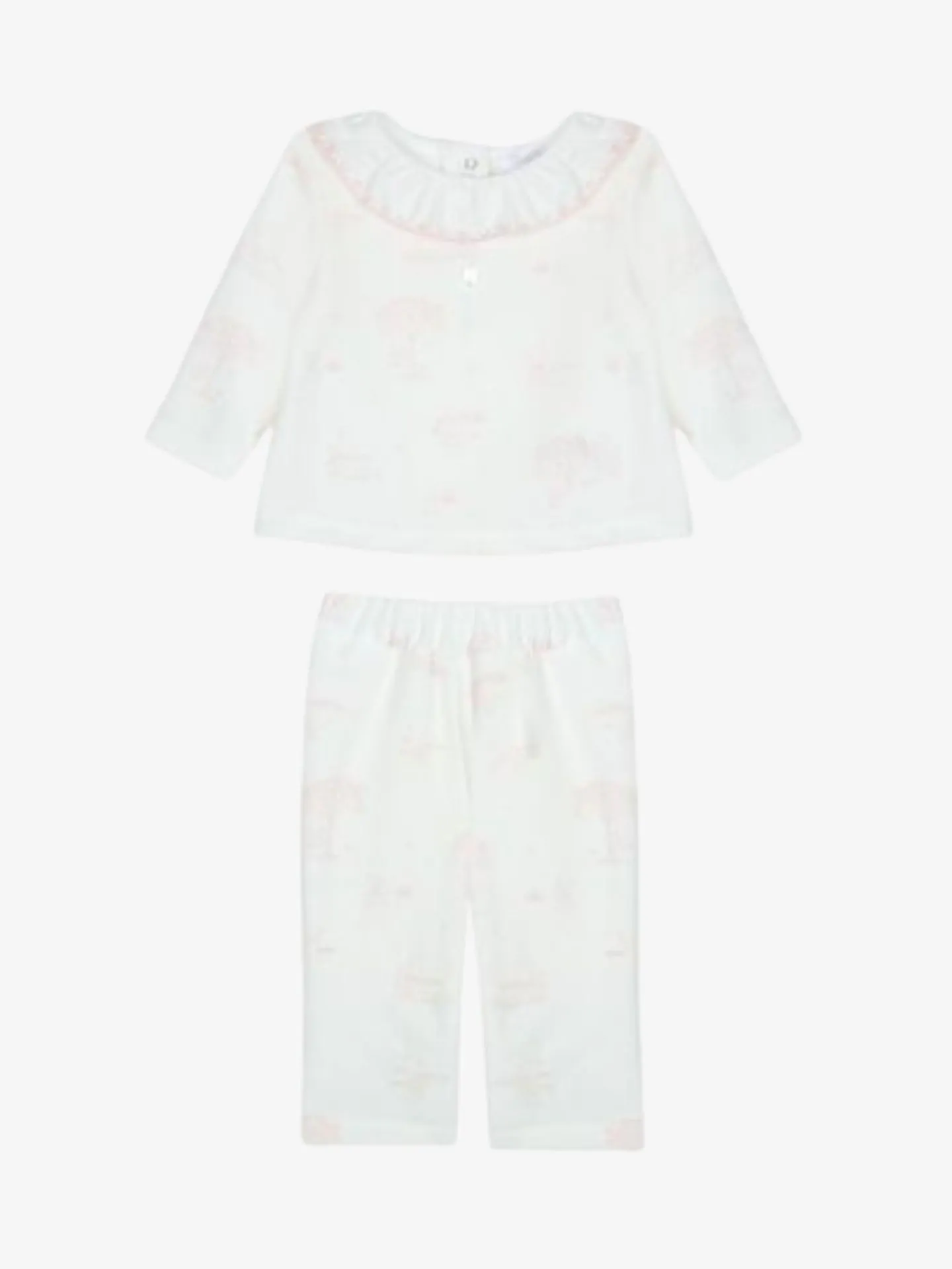 Heerlijke witte set van velours, met een delicate, zoete toile du jouy-print en een charmante kraag met ruches en subtiel roze borduursel. Comfy en zacht voor je babymeisje.