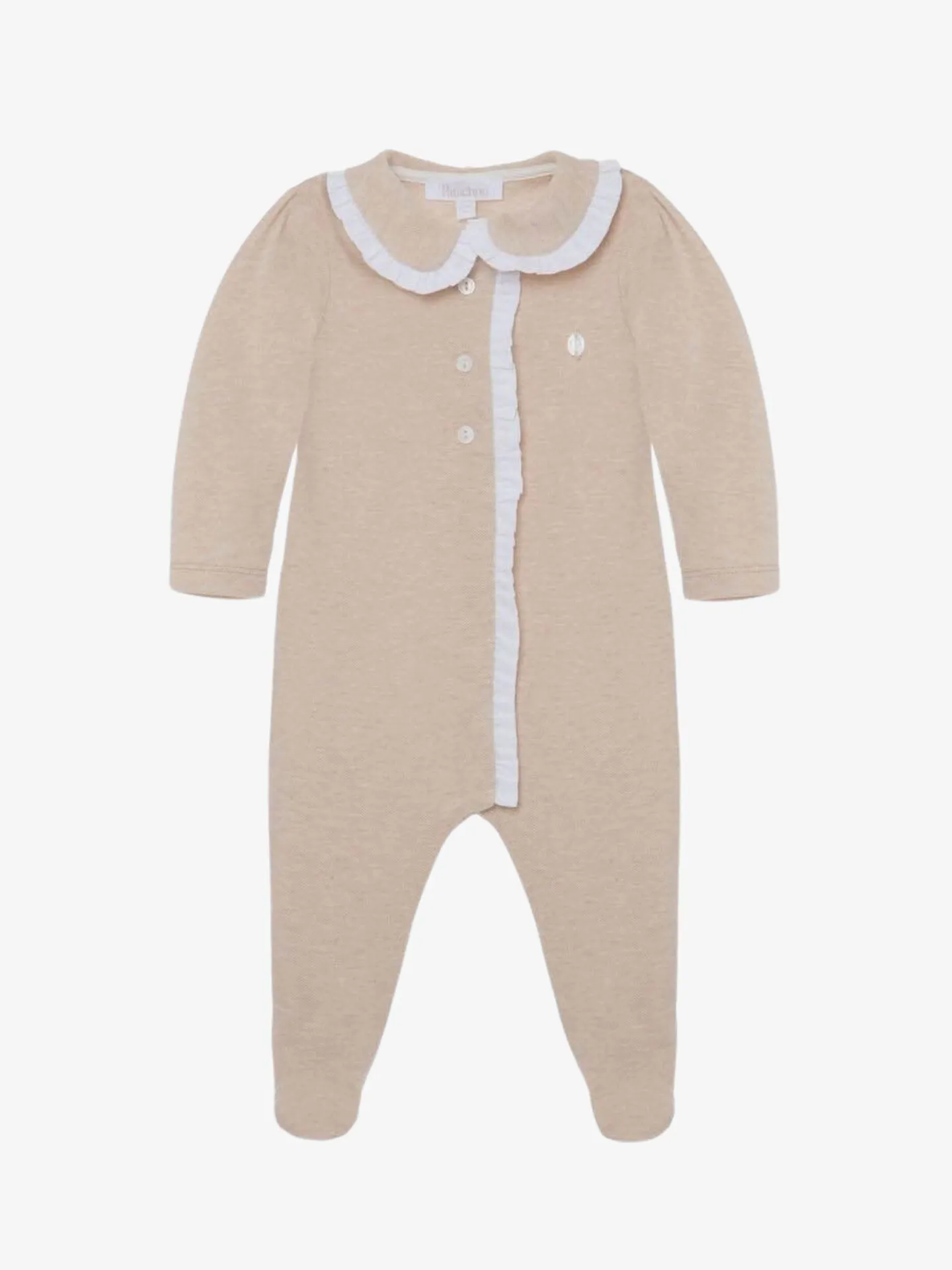 Het Patachou Boxpakje in de kleur Beige bestaat uit een drukknoopsluiting aan de voorkant, een kraagje met wit roezel randje en een roezelrandje bij de knoopsluiting.