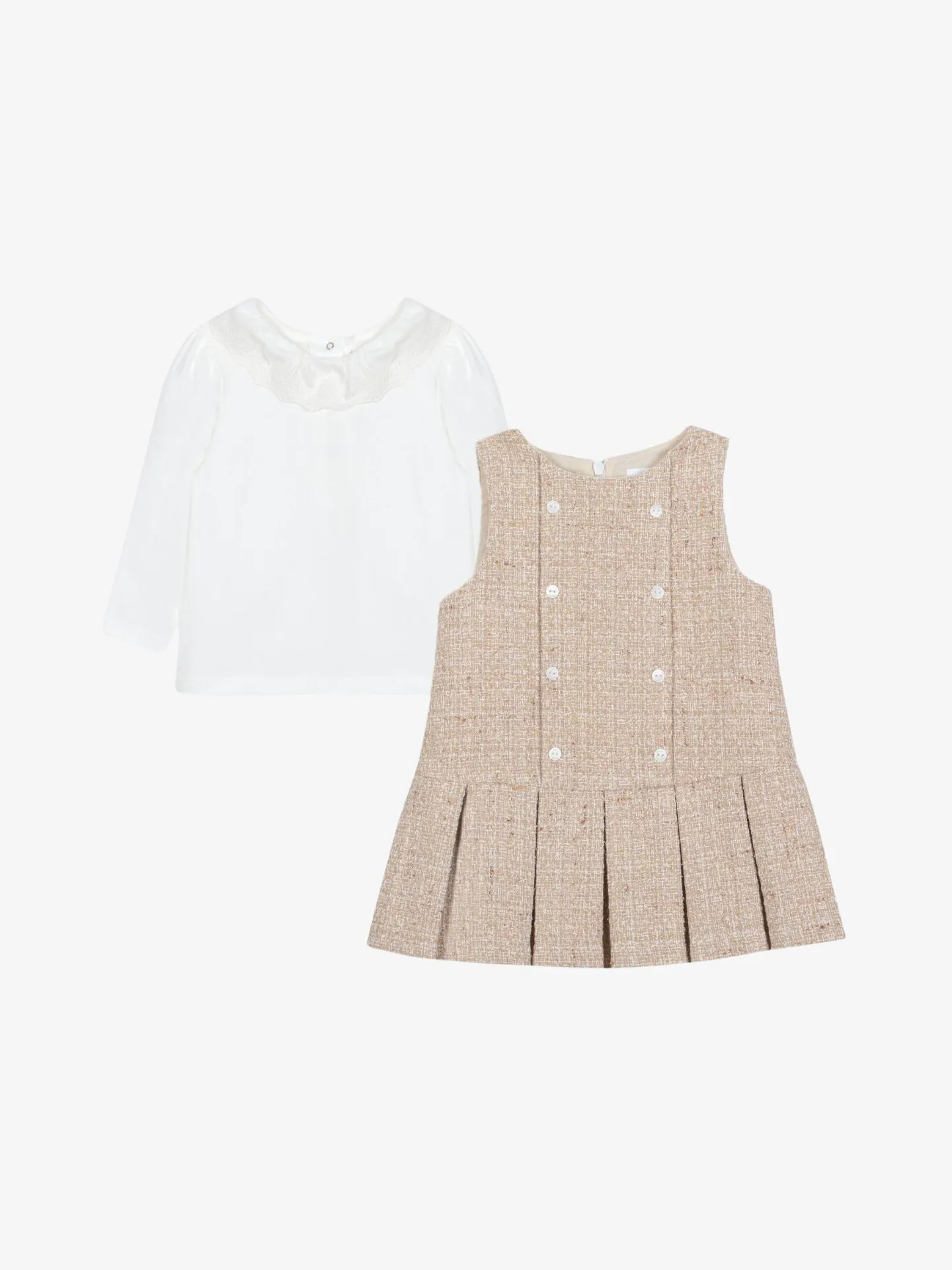 Deze heerlijke tweedelige set bestaat uit een mouwloze, beige tweed overgooierjurk met een double-breasted knoopdetail en een geplooide rok. De jurk wordt gecombineerd met een zachte, witte jersey top met lange mouwen en een subtiel geplooide kraag. Deze veelzijdige outfit biedt zowel comfort als een vleugje klassieke elegantie.