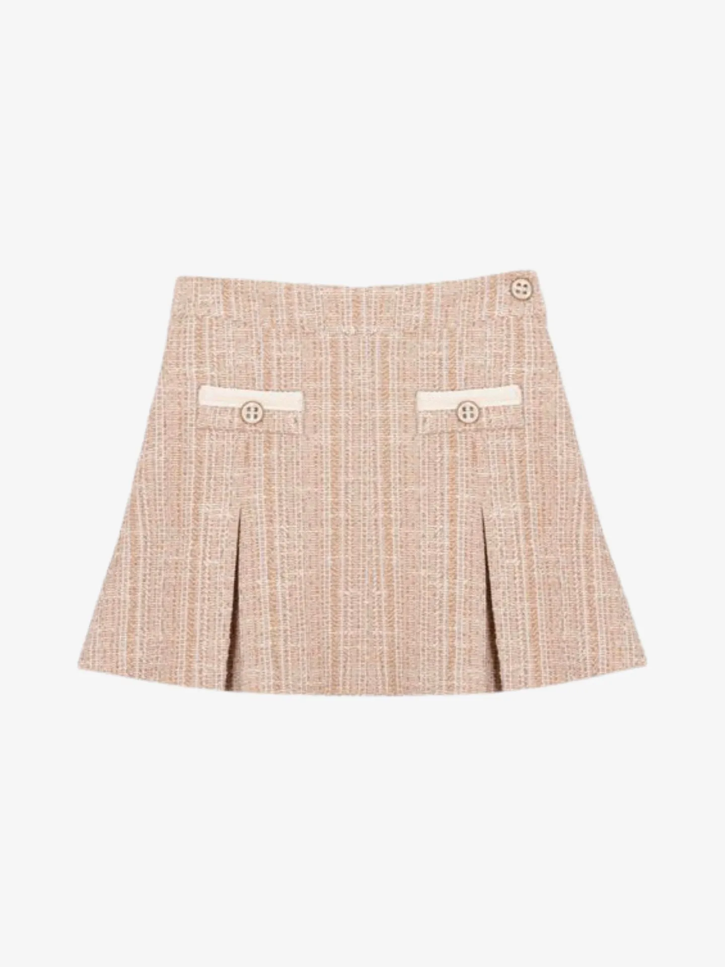 Deze stijlvolle A-lijn rok is gemaakt van beige tweedstof. Hij heeft decoratieve zakken aan de voorkant met een contrasterende bies en parelachtige knoopdetails, en subtiele plooien voor een flatterende pasvorm.