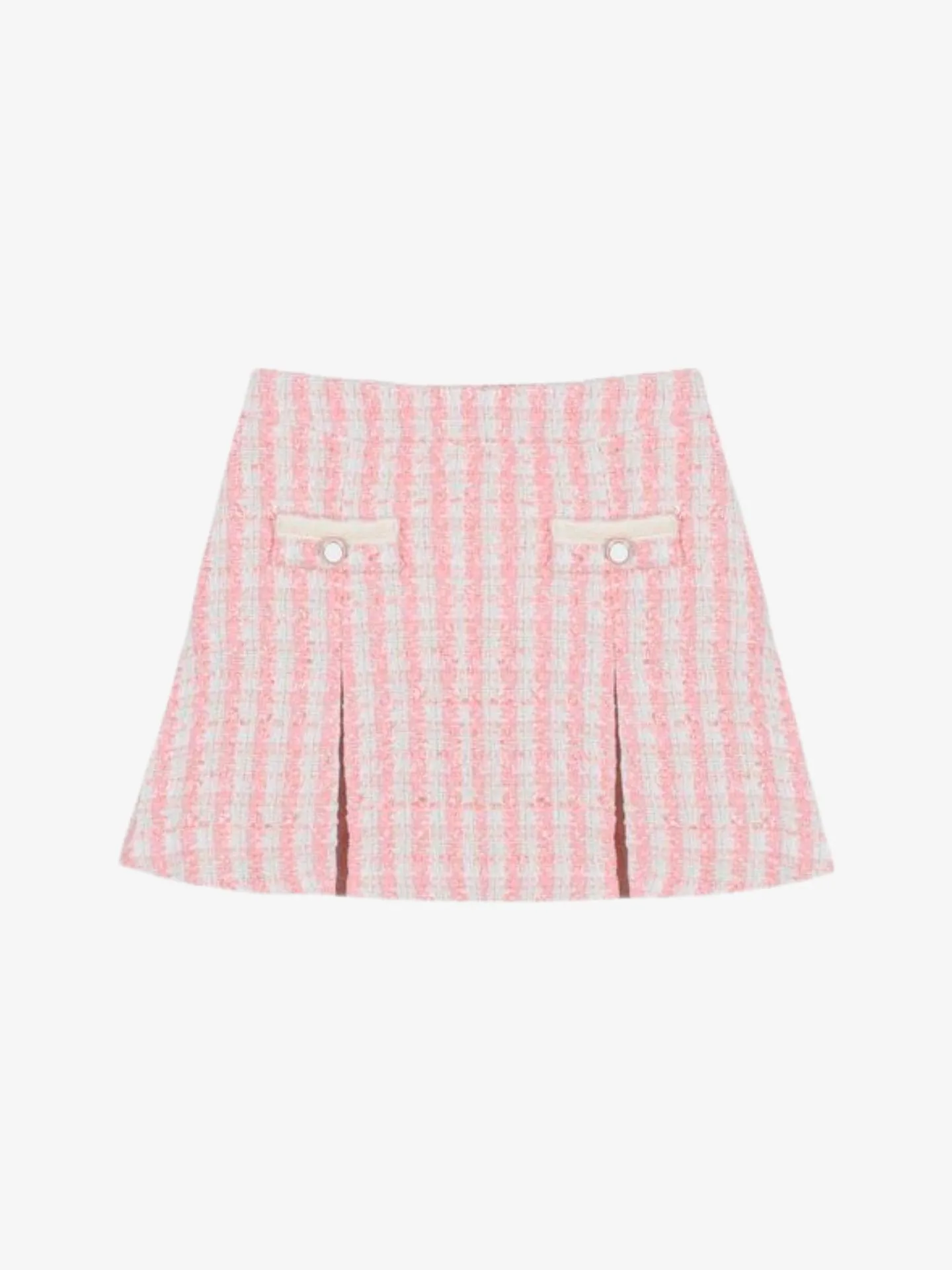 Deze stijlvolle A-lijn rok is gemaakt van lichtroze tweedstof. Hij heeft decoratieve zakken aan de voorkant met een contrasterende rand en parelachtige knoopdetails, en subtiele plooien voor een flatterende pasvorm.