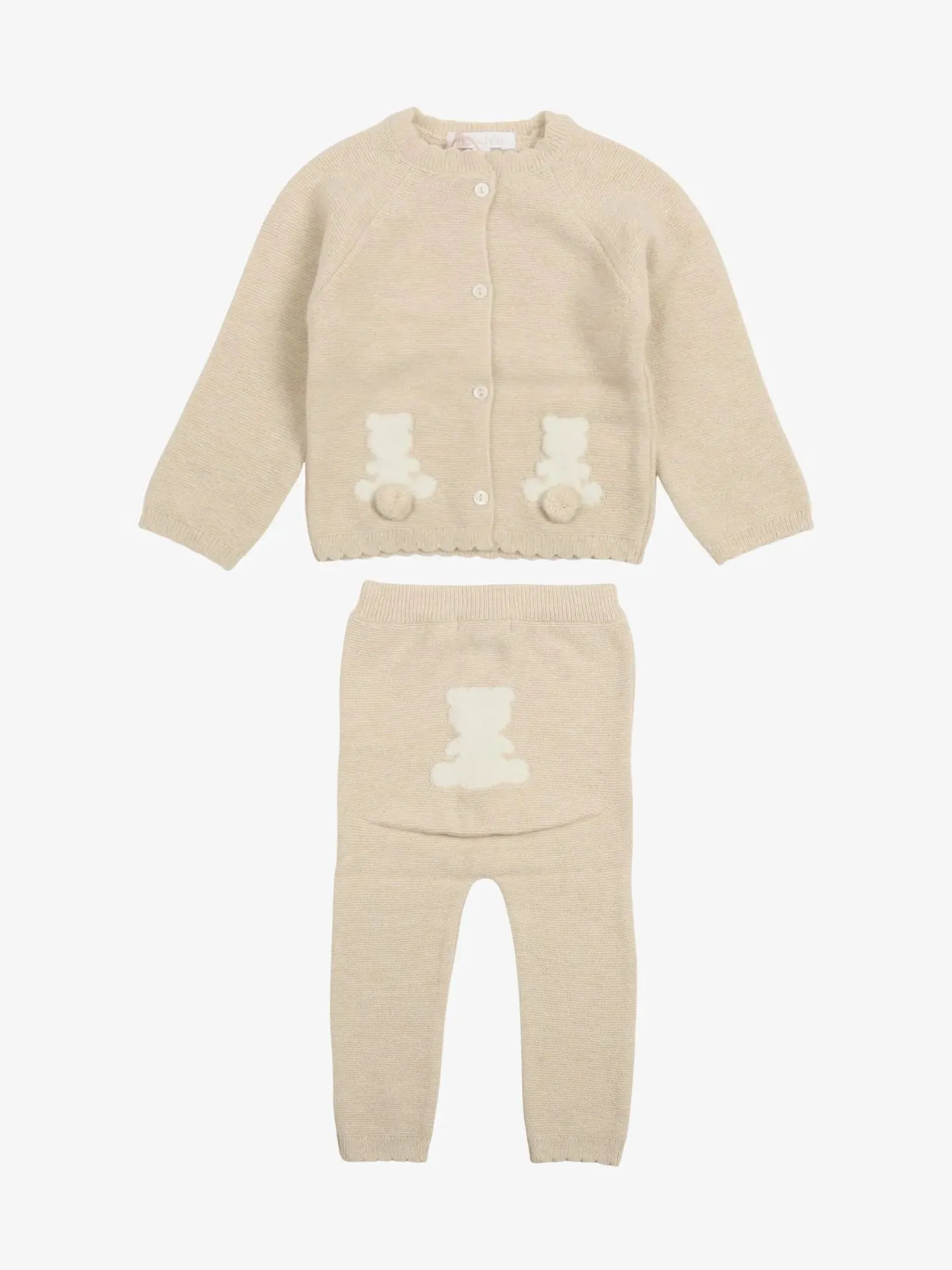 Super schattig beige gebreid vestje met geborduurde beren en pompons op de voorkant. Vestje is voor 25% van merinowol waardoor hij heerlijk warm is voor de winter.