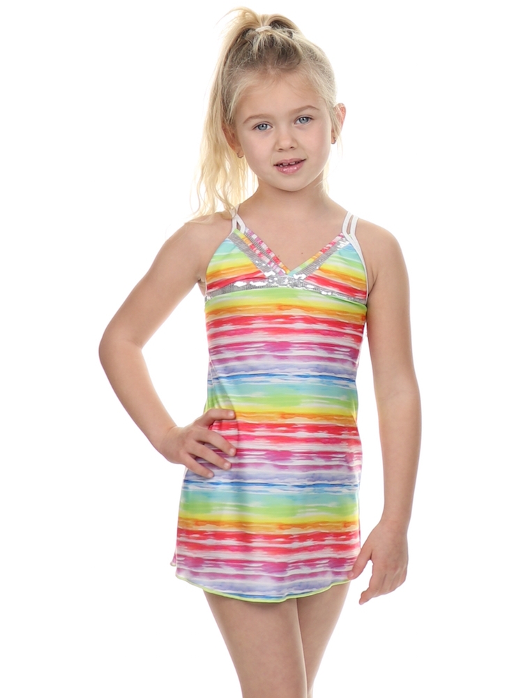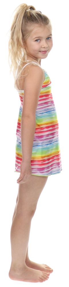 De Robe Eclipse Horizon van Pate de Sable heeft een all over regenboog printje. De jurk heeft zilveren pailletten aan de bovenkant. De jurk past perfect bij de 2p Licorne Horizon bikini. Whitney is 124 cm en draagt maat 6J