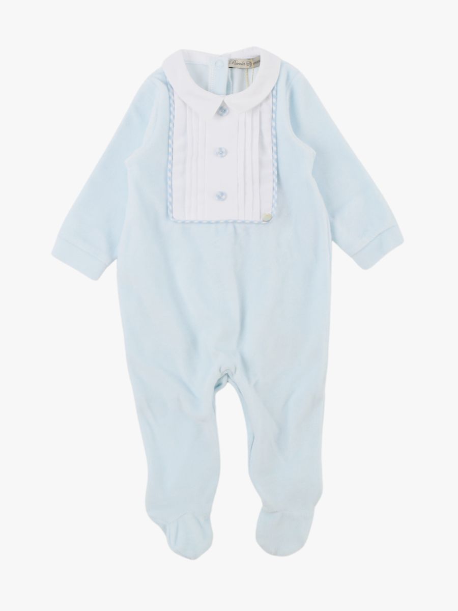 Schattige babypakje in de kleur licht blauw van velvet kwaliteit. Het is gecombineerd met een witte kraag gedeelte.