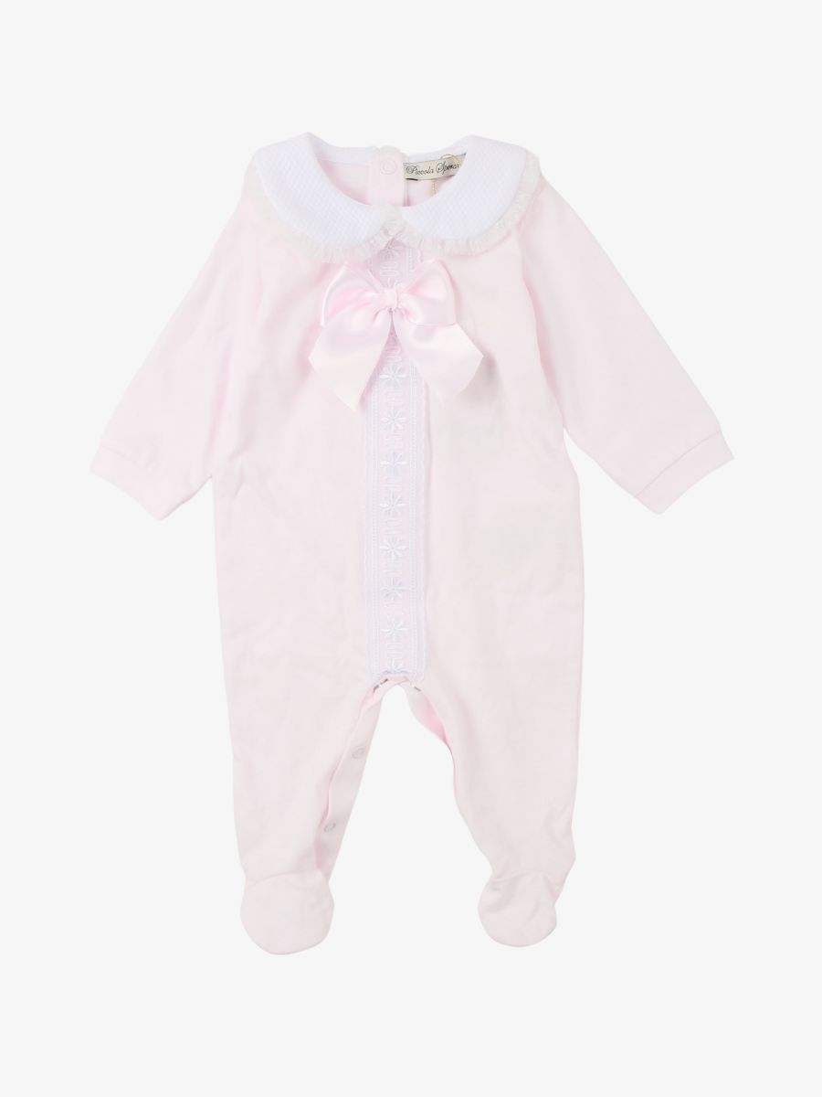 Heel erg schattig is deze meisje baby boxpakje in de kleur roze met een witte kraag met een grote roze strikje. Dit babypakje is van het merk Piccola Speranza.