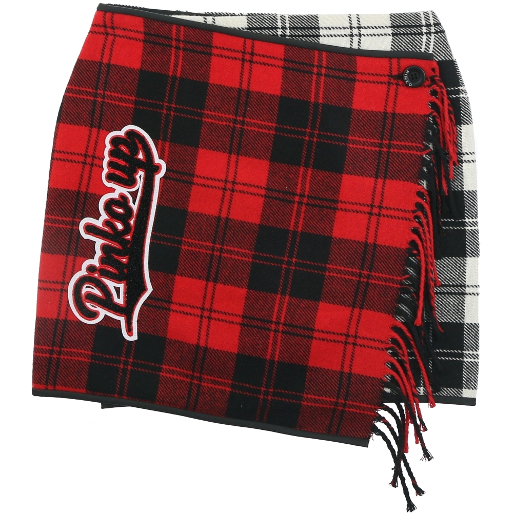 Dit rokje van Pinko heeft een asymmetrisch effect, all over ruitpatroon in twee verschillende kleuren, franjes, knoopsluiting en logo embleem. Combineer het rokje met de bijpassende sweater. Pasvorm: Valt groot Indy is 1.54m en draagt maat 10.