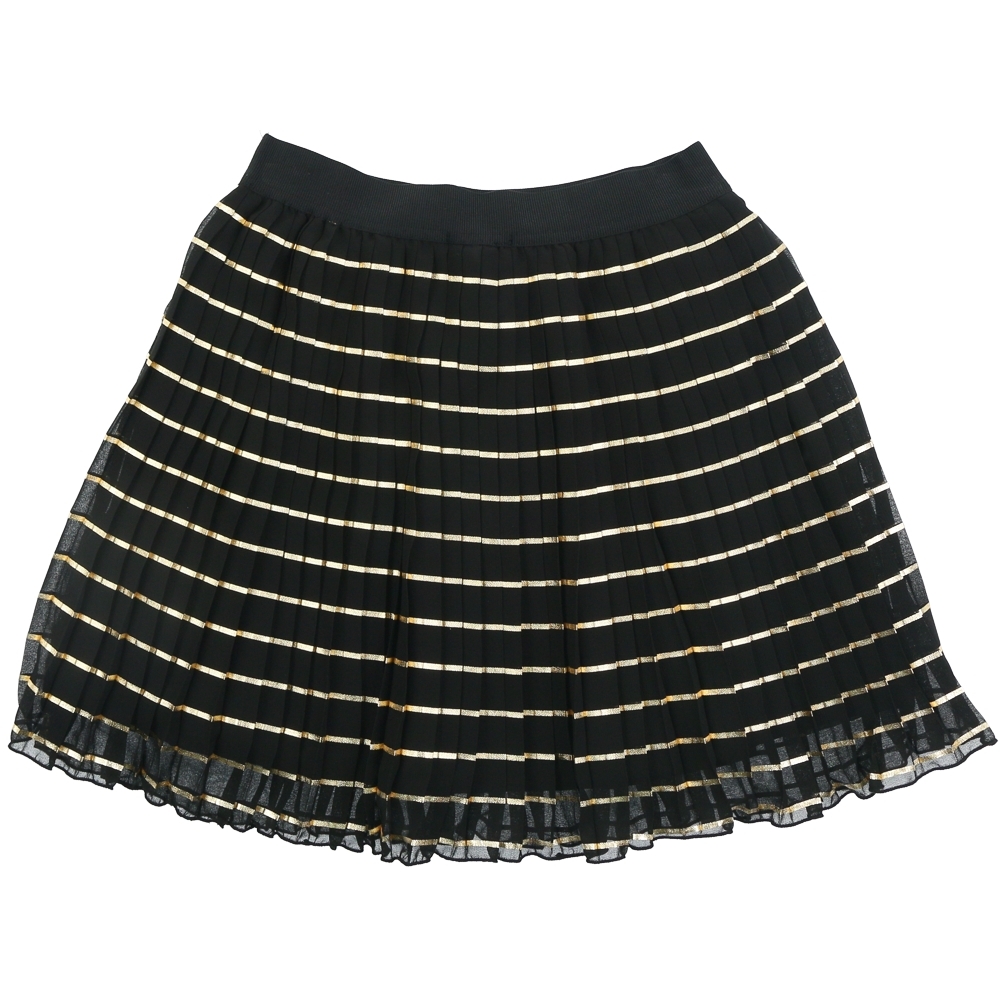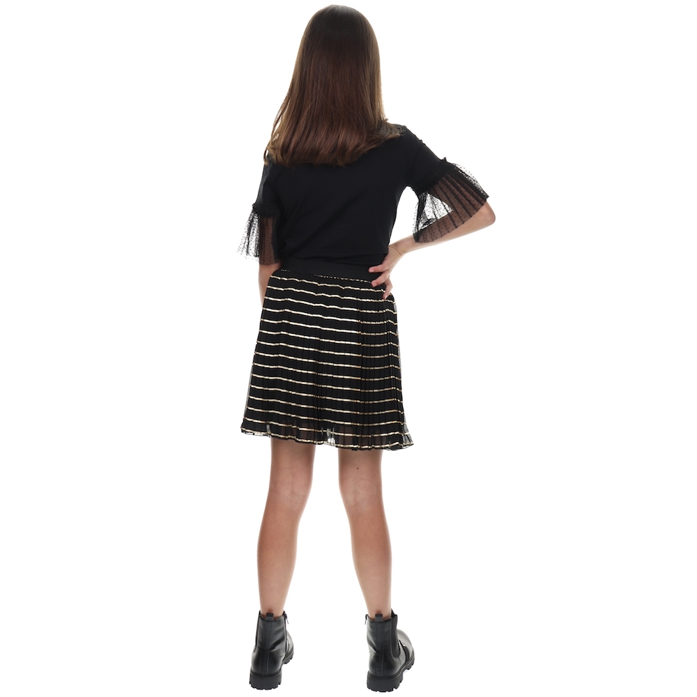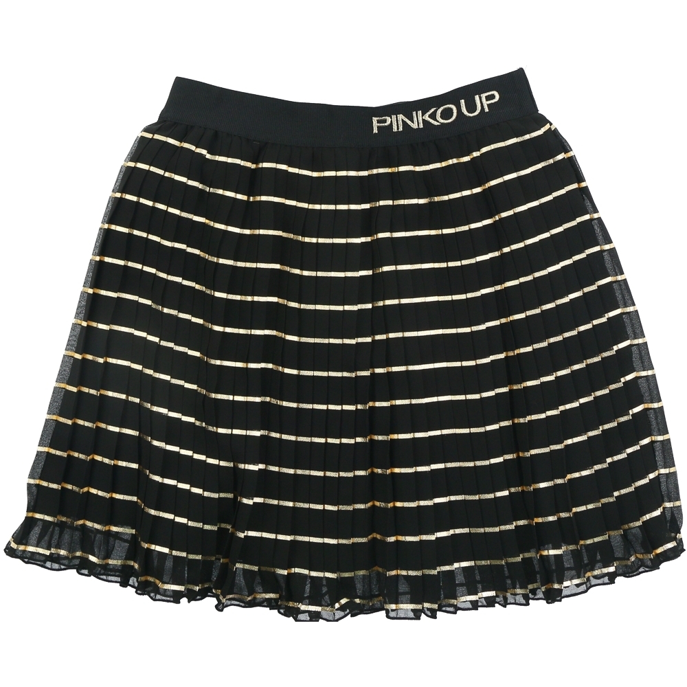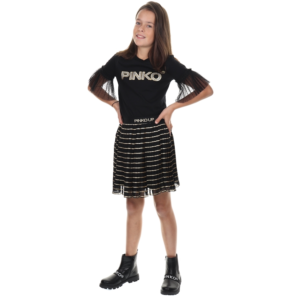 Het rokje van Pinko is een plisse model, met gouden strepen, een ruffle aan de onderkant en een elastische tailleband met het logo in het goud. Combineer de legging met een t-shirt, longsleeve of hoodie van Pinko. Materiaal: 100% Polyester Eva is 1.45M, en draagt maat 10J.