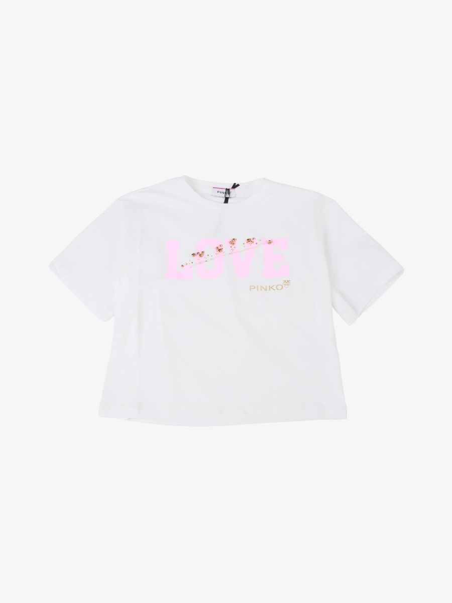 Witte croptop van het Italiaanse merk Pinko. De top heeft een ronde hals, korte mouwen en een opdruk aan de voorzijde. Combineer de top met een short, rok of spijkerbroek.