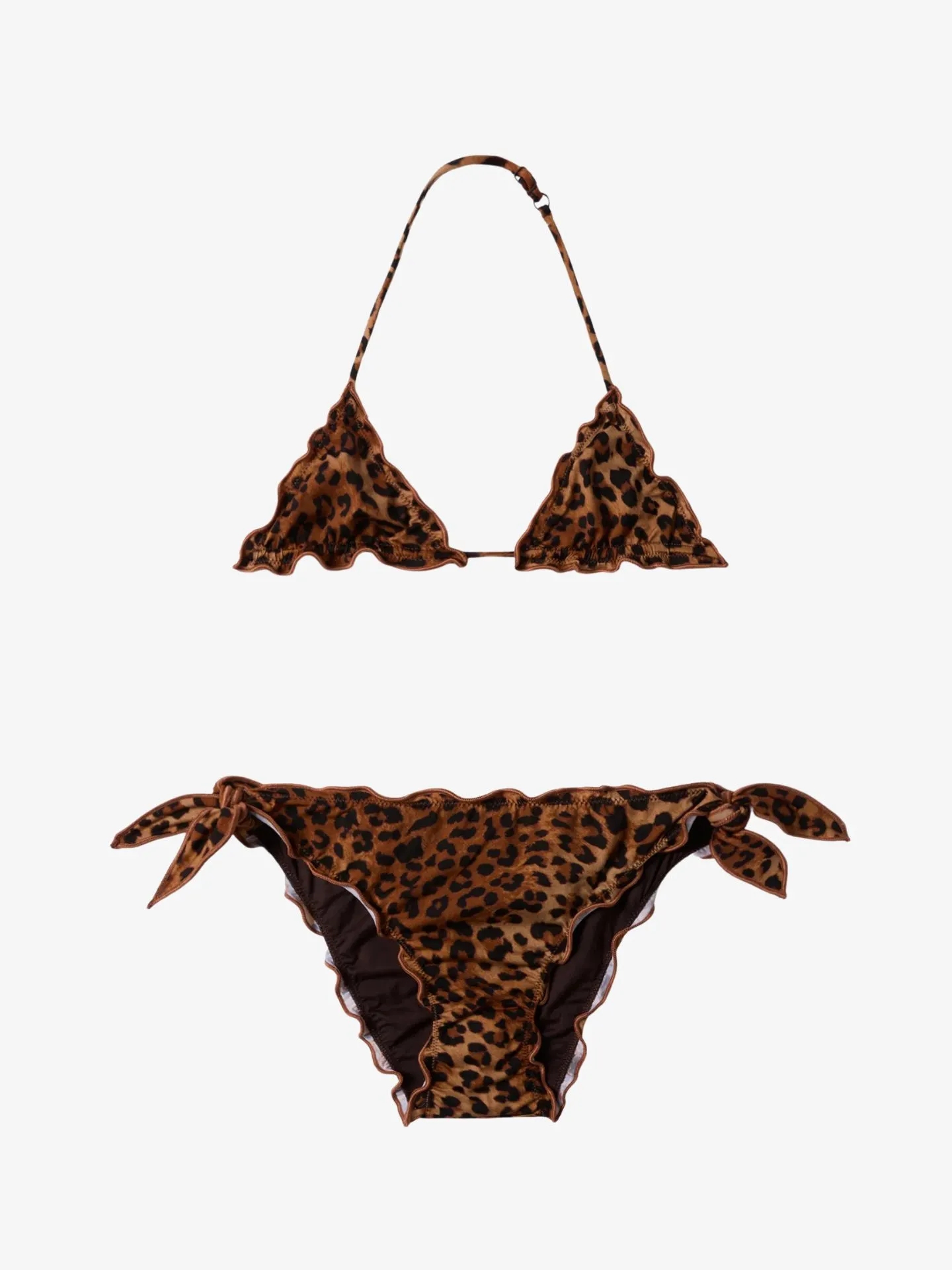 Triangel bikini met leopard print van het Italiaanse merk Mc2 Saint Barth. De bikini met geschulpte randjes heeft verstelbare bandjes bij zowel de top als het broekje.
