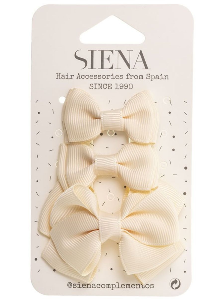 De haarstrikken van Siena zijn handgemaakt in Spanje. De set bestaat uit twee kleine strikken van 4,5 centimeter met clips en een grote strik van 7 centimeter met clip. De haarstrikken zijn in de kleur Cream. - 2 clips 4,5 cm - 1 clip 7 cm