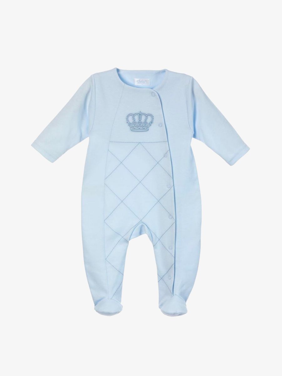 Cotton openable babygrow for boys Long sleeve Color: blue Decorative crown print on the front Concealed poppers front opening 100% Cotton Designed and manufactured in Poland (UE) Elegant cotton babygrow perfect for a newborn baby. Popper fastenings with nickel-free snaps for easy dressing and changing. Made in soft and stretchy 100% cotton with Oeko-Tex Standard 100 certificate.