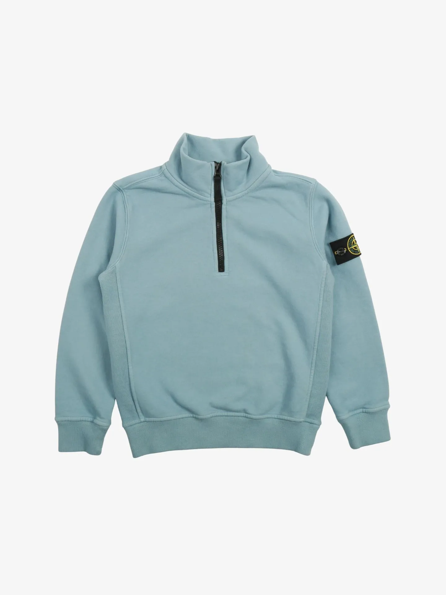 Sweater in de kleur Powder Blue van het merk Stone Island. De sweater heeft een hoge kraag met ritssluiting, elastische boorden en afneembaar logo embleem op de linkermouw.