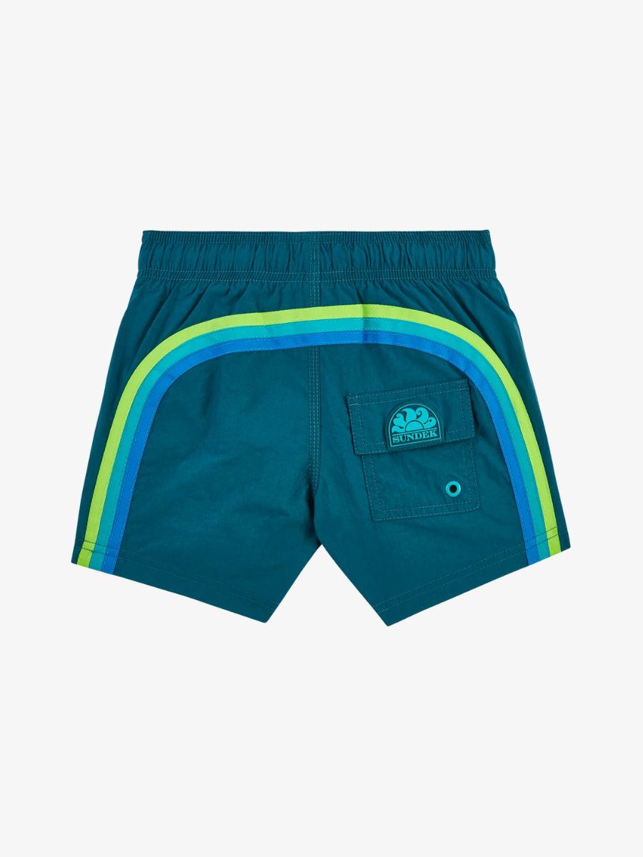 De Sundek Boardshort staat bekend om de gekleurde strepen aan de achterzijde. De zwembroek heeft het logo ook aan de achterkant en steekzakken. De zwembroek is in de kleur Loch en is aan te snoeren in de taille.