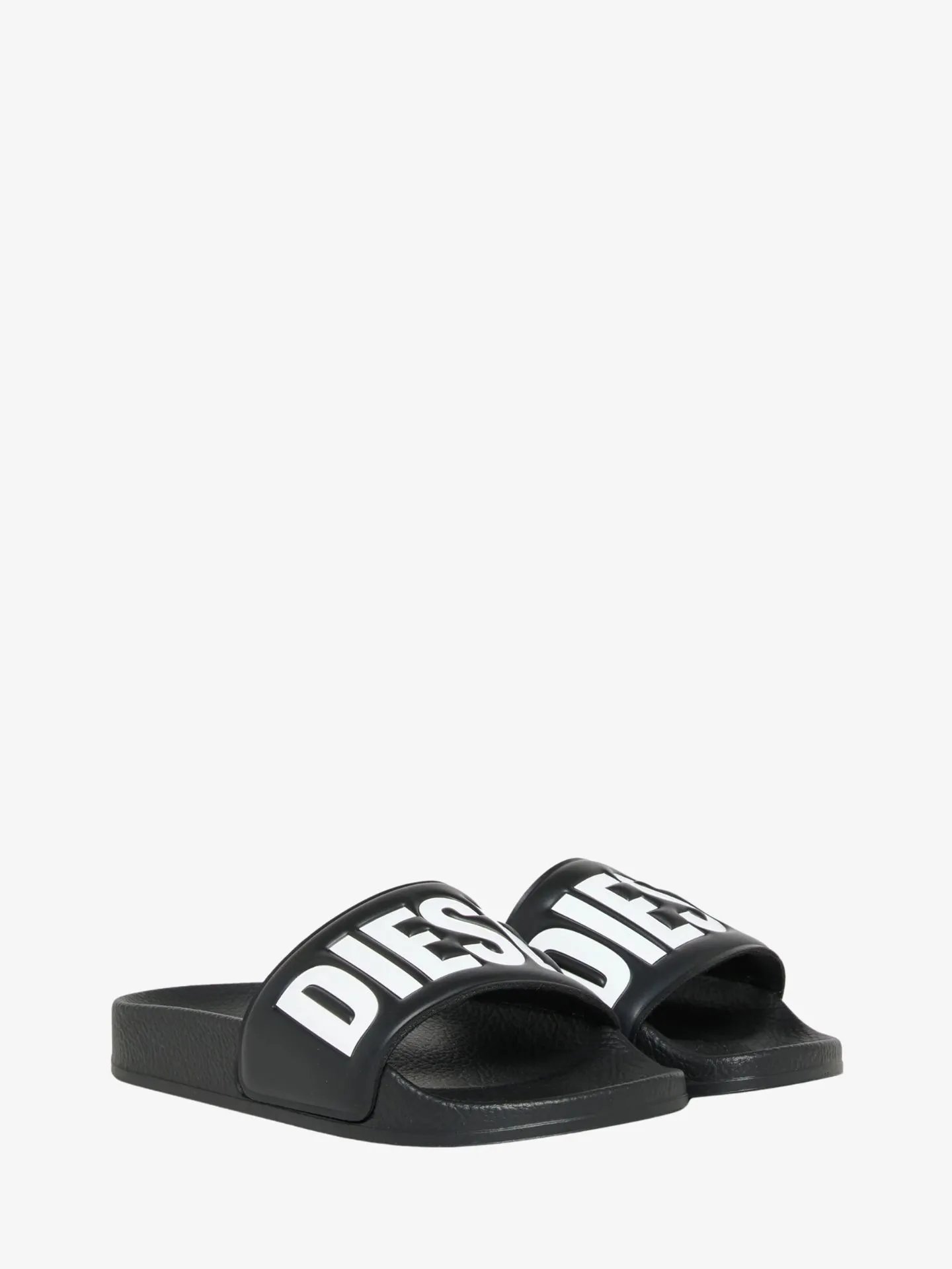 Waterbestendige slippers gemaakt van een duurzame en flexibele rubberstof. Ontworpen met een voorgevormd voetbed voor optimaal draagcomfort. Voorzien van een opvallend wit DIESEL logo-artwork, op beide voeten. Combineer met een bijpassende zwemshort en een t-shirt voor een stoere en sportieve strandlook