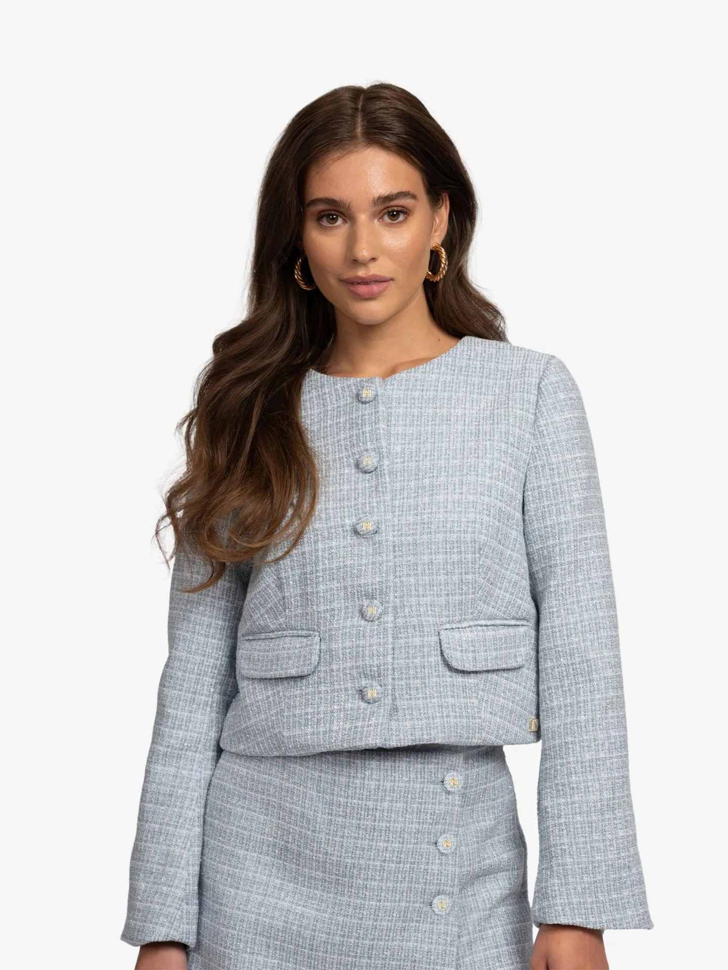 Kort tweed jack met een ronde hals, een knoopsluiting en normale pasvorm. Combineer samen met de bijpassende Kline skort in Teal Blue uit de Nikkie collectie.
