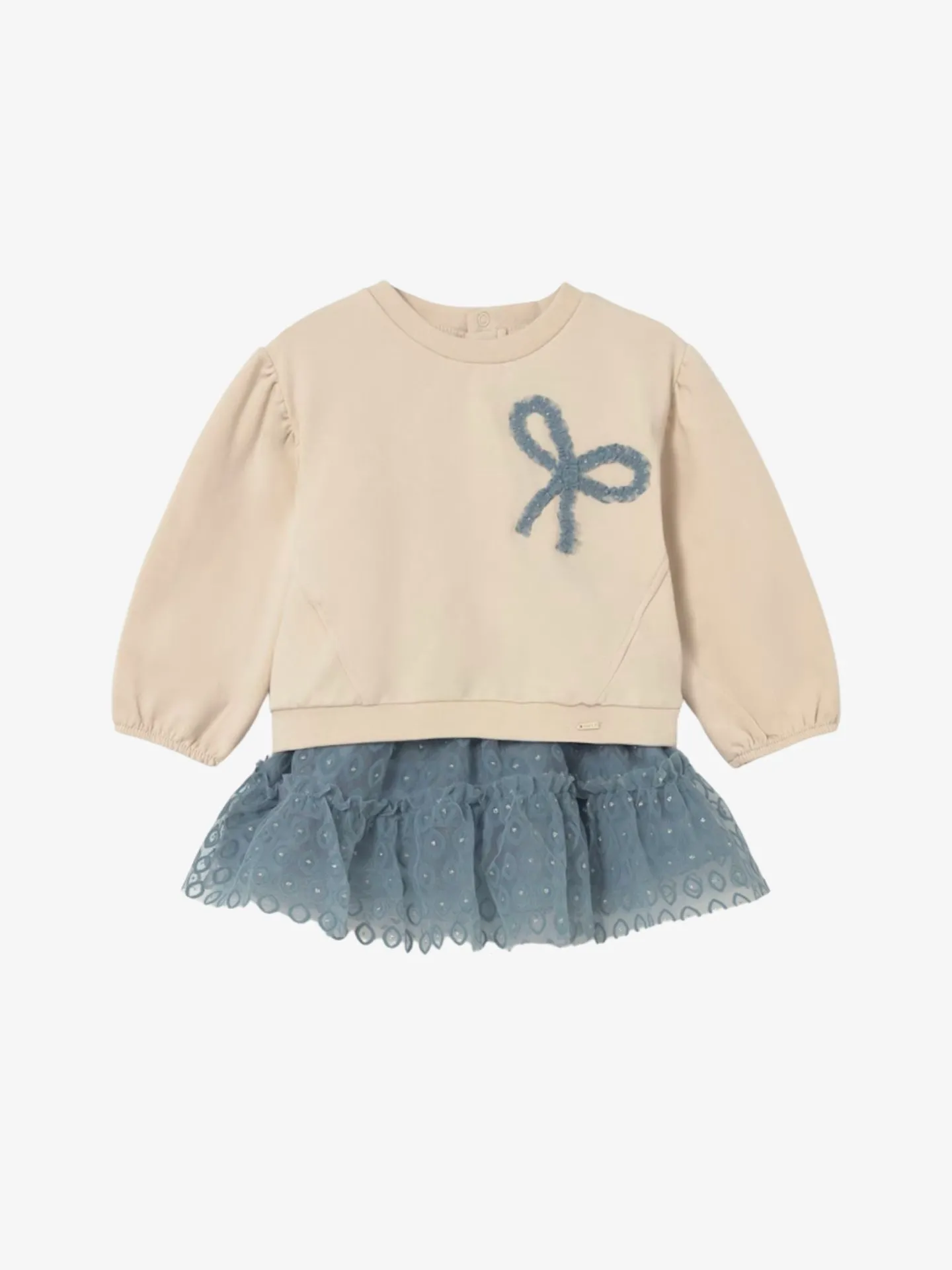 De Mayoral Set in de kleur Blue Bell bestaat uit een sweater met pofmouw en strikje met tulle en een tulle rokje met klein glittertje. Combineer met een maillotje voor de winter.
