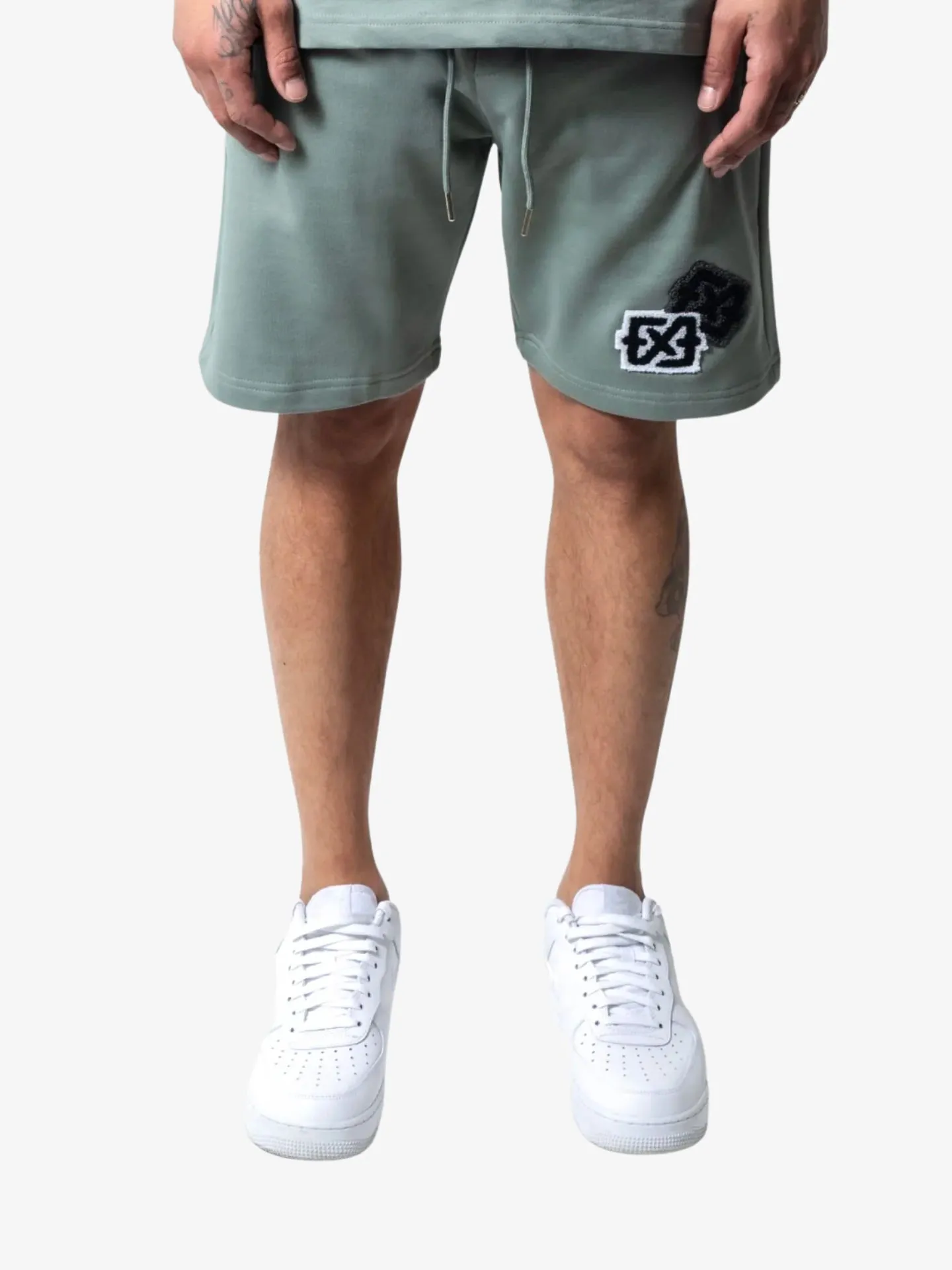 XPLCT studios mannen short in de kleur warm pastel groene kleur met applicaties XPLCT studios logo