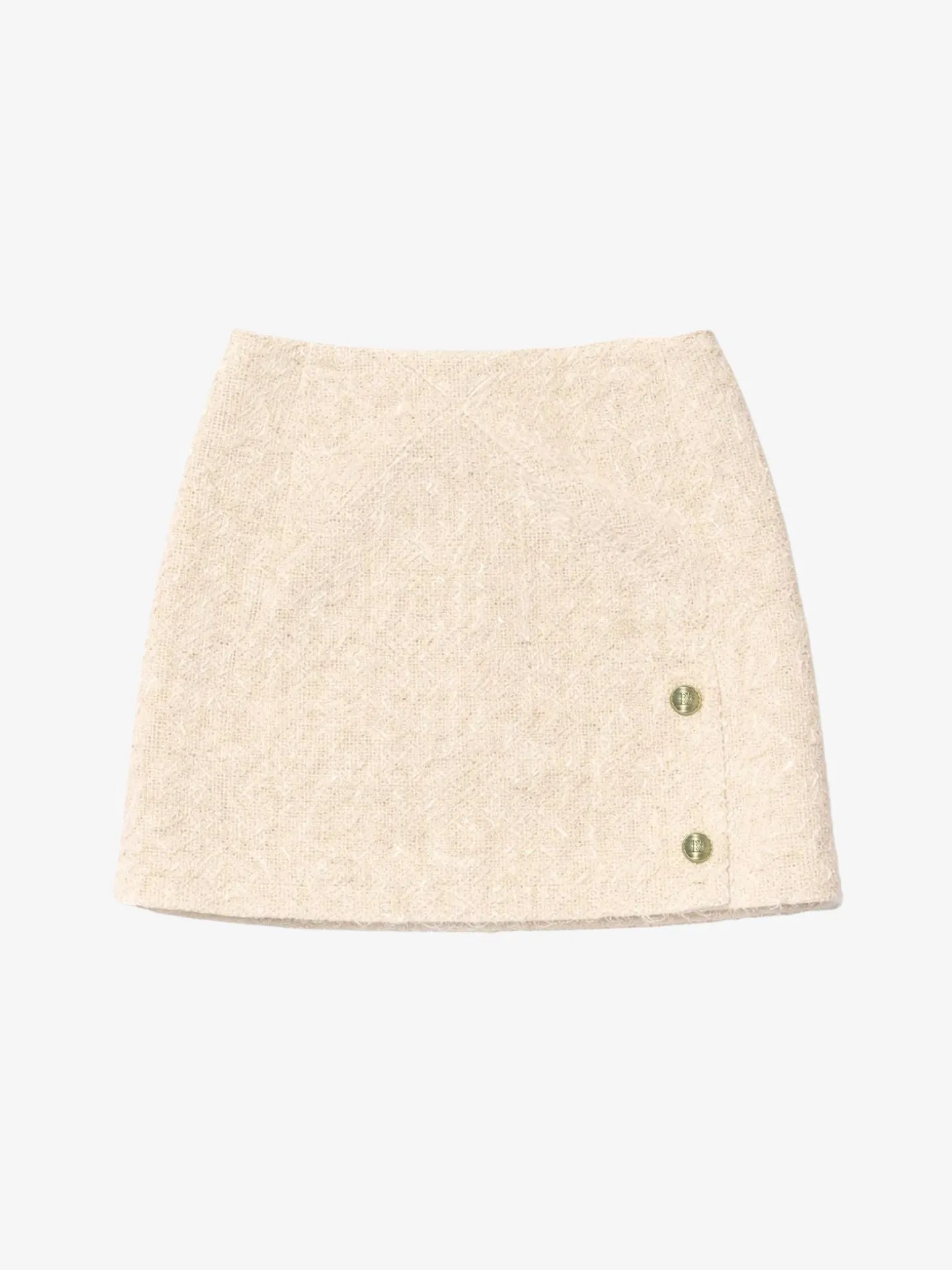 Deze korte rok is uitgevoerd in een fluffy stof met subtiele glitters voor een speelse en luxe uitstraling. De decoratieve knopen geven het ontwerp een stijlvolle touch, terwijl de blinde ritssluiting zorgt voor een strakke afwerking. Dankzij de normale pasvorm is de rok comfortabel en veelzijdig te dragen.