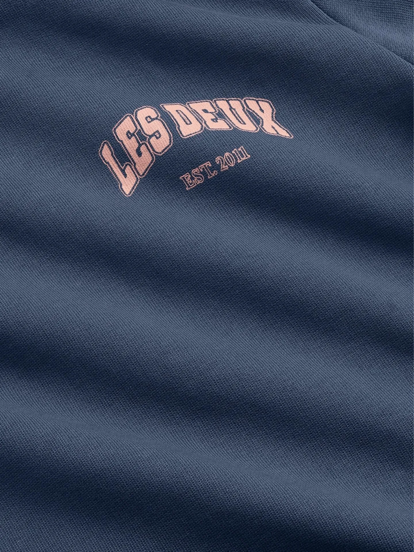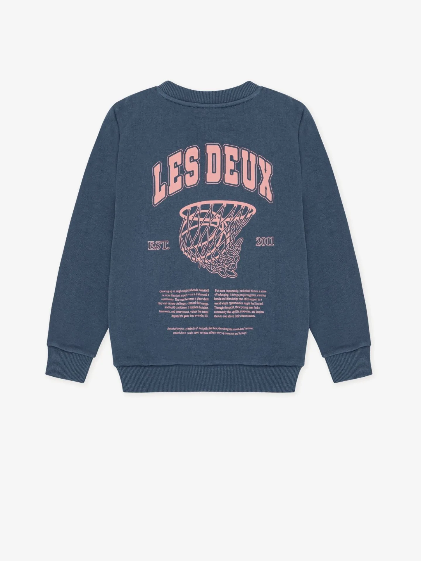 Denim blauwe sweater van het Deense merk Les Deux. De sweater heeft een ronde hals, lange mouwen, klein logo aan de voorzijde en een groot merk logo aan de achterkant.