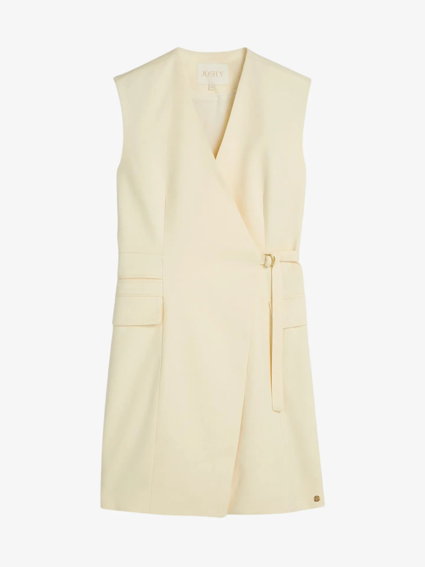 De JOSH V Henley dames jurk in de kleur Butter Yellow is een korte overslagjurk. De lichtgele jurk is gemaakt van een comfortabele kwaliteit met gerecycled polyester, viscose en elastaan. De binnenvoering zorgt voor extra comfort. Door middel van een overslag sluit de jurk. Op de goudkleurige buckle van de sluiting is het JOSH V logo verwerkt. Draag deze mouwloze blazerjurk in combinatie met sandalen of heels voor verschillende looks.