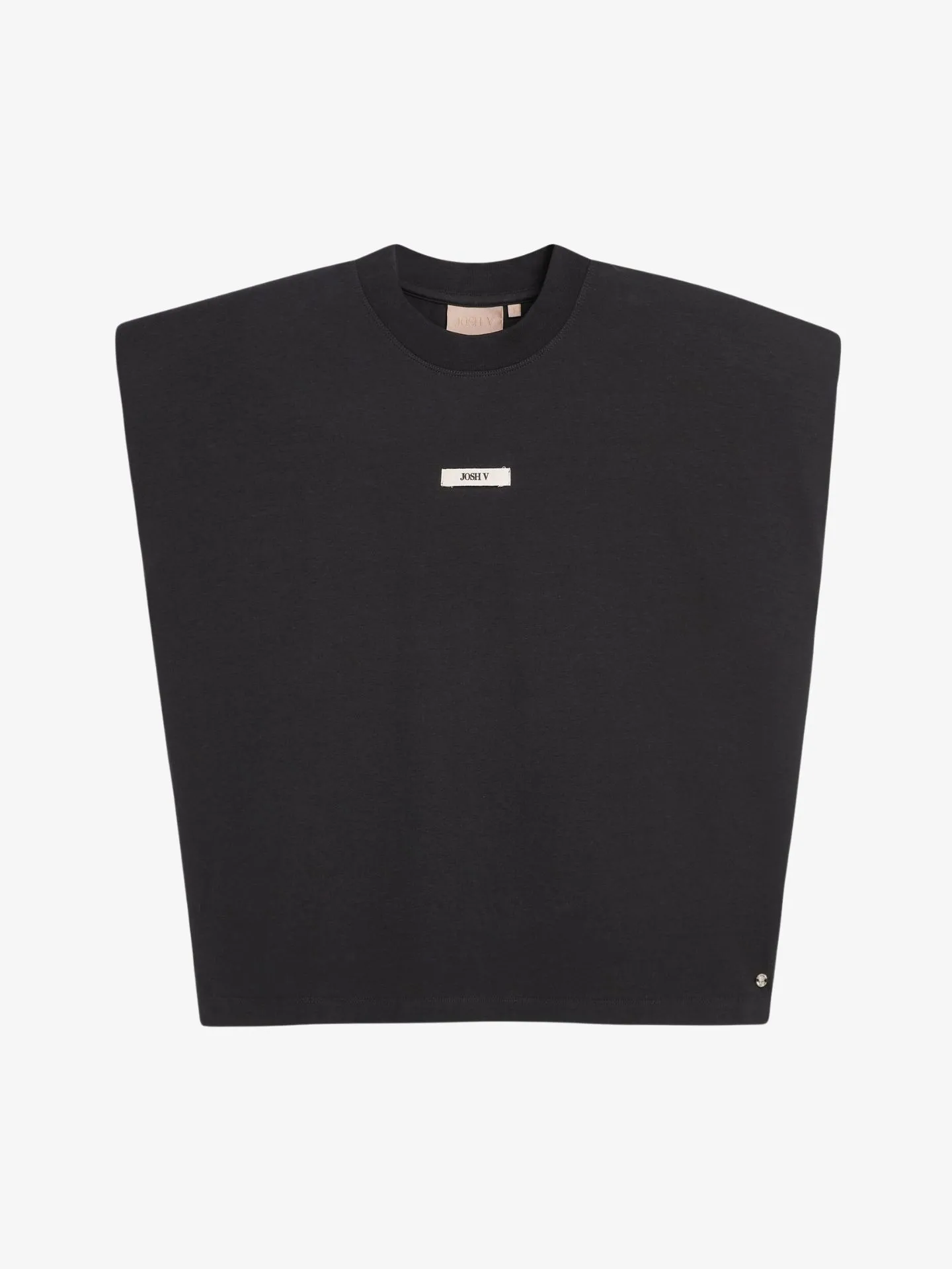 Het JOSH V Sue dames T-shirt in de kleur Black is gemaakt van katoen met stretch, ingekocht via het Better Cotton Initiative. Het mouwloze design, de ronde hals en de subtiele schoudervullingen zorgen voor een moderne uitstraling. Draag het T-shirt casual met een jeans of combineer met een blazer en pantalon voor een geklede look.