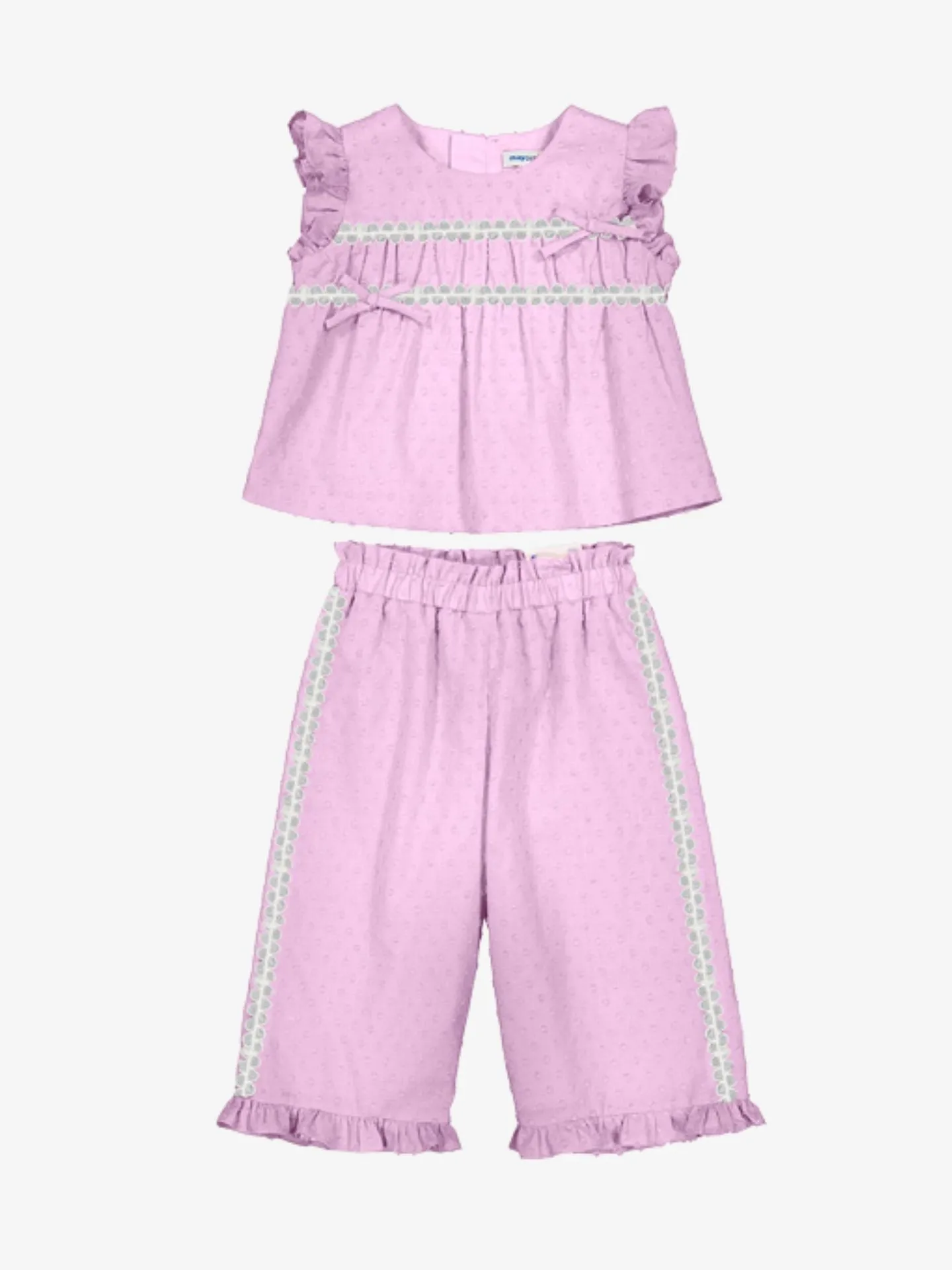 2-delige set van het Spaanse merk Mayoral. De set bestaat uit een top en pantalon. De top heeft een ronde hals, ruches langs de armopeningen en sierstrikjes. De pantalon heeft een elastische tailleband met ruches en ruches aan de onderzijde van de broekspijpen.