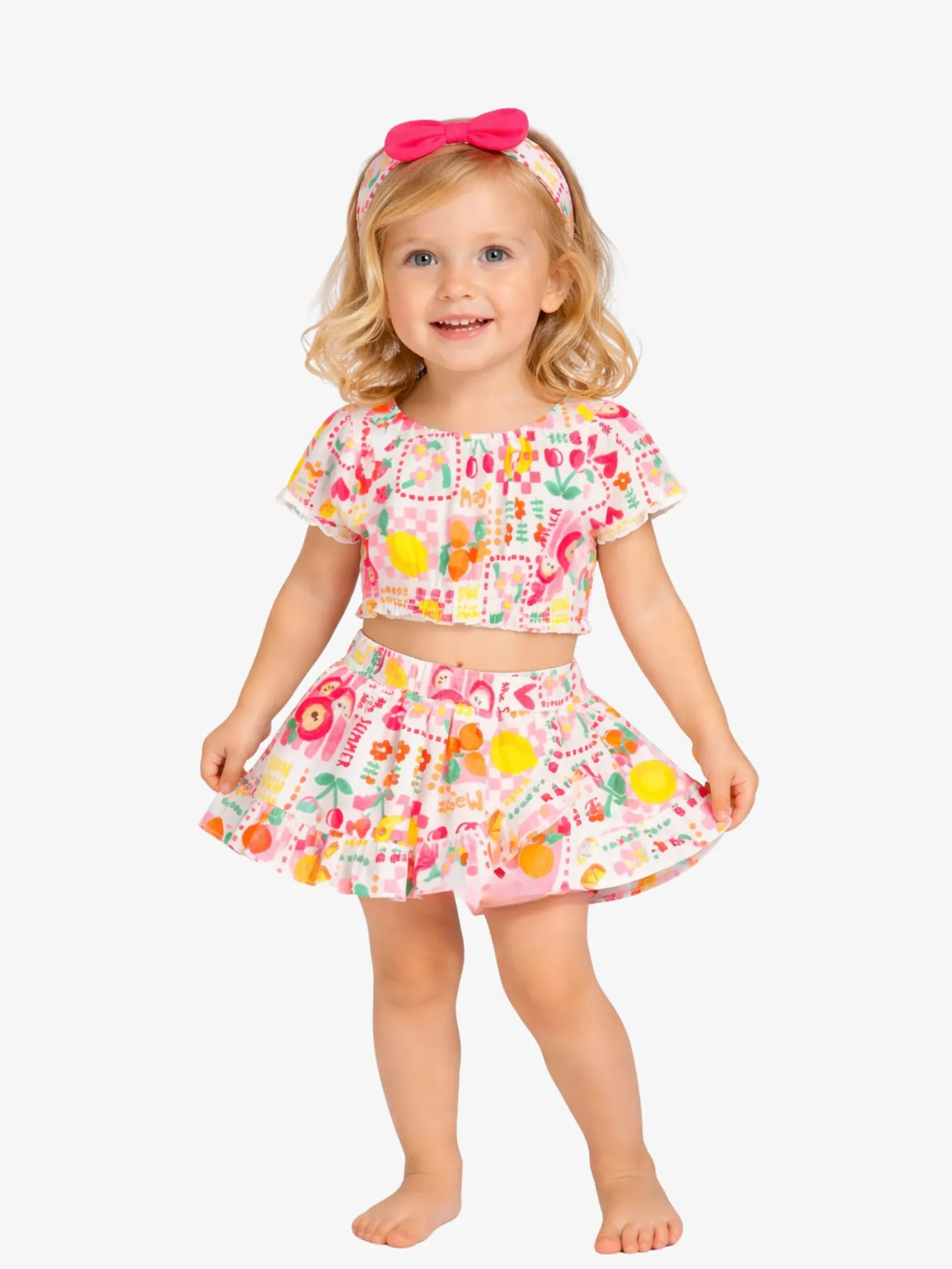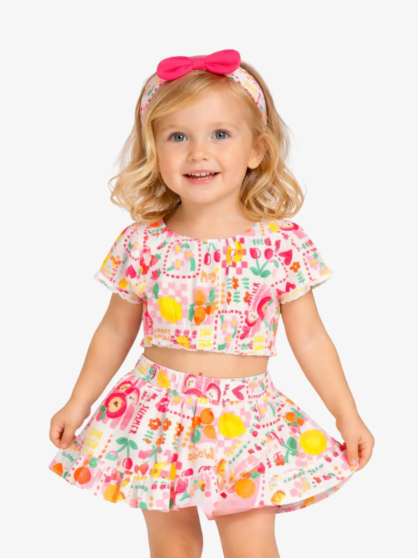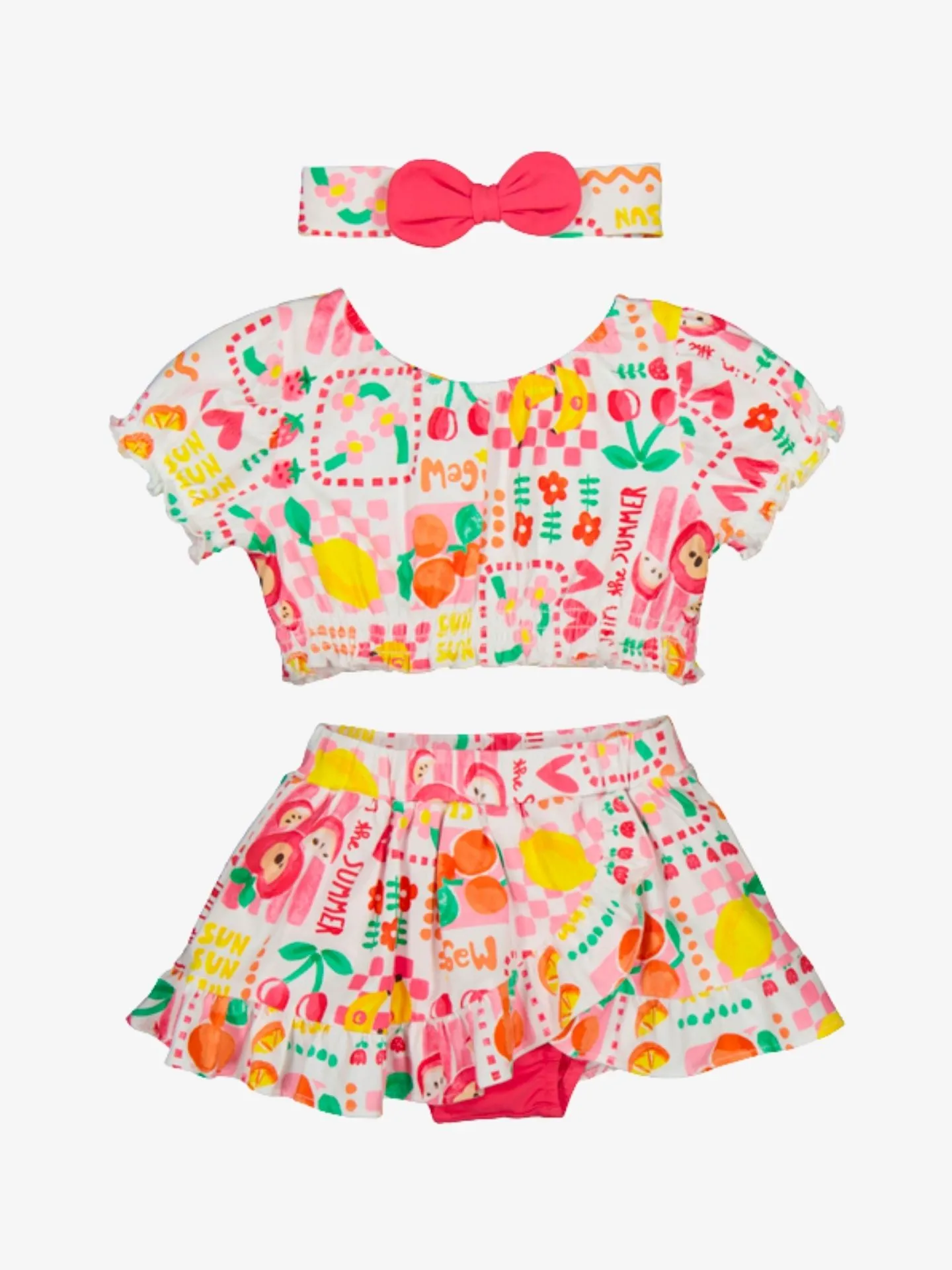 3-delige set van het Spaanse merk Mayoral. De set bestaat uit een top , haarband en rok. De korte top heeft een ronde hals, korte mouwen en een all-over bloemen print. De rok heeft een elastische tailleband.