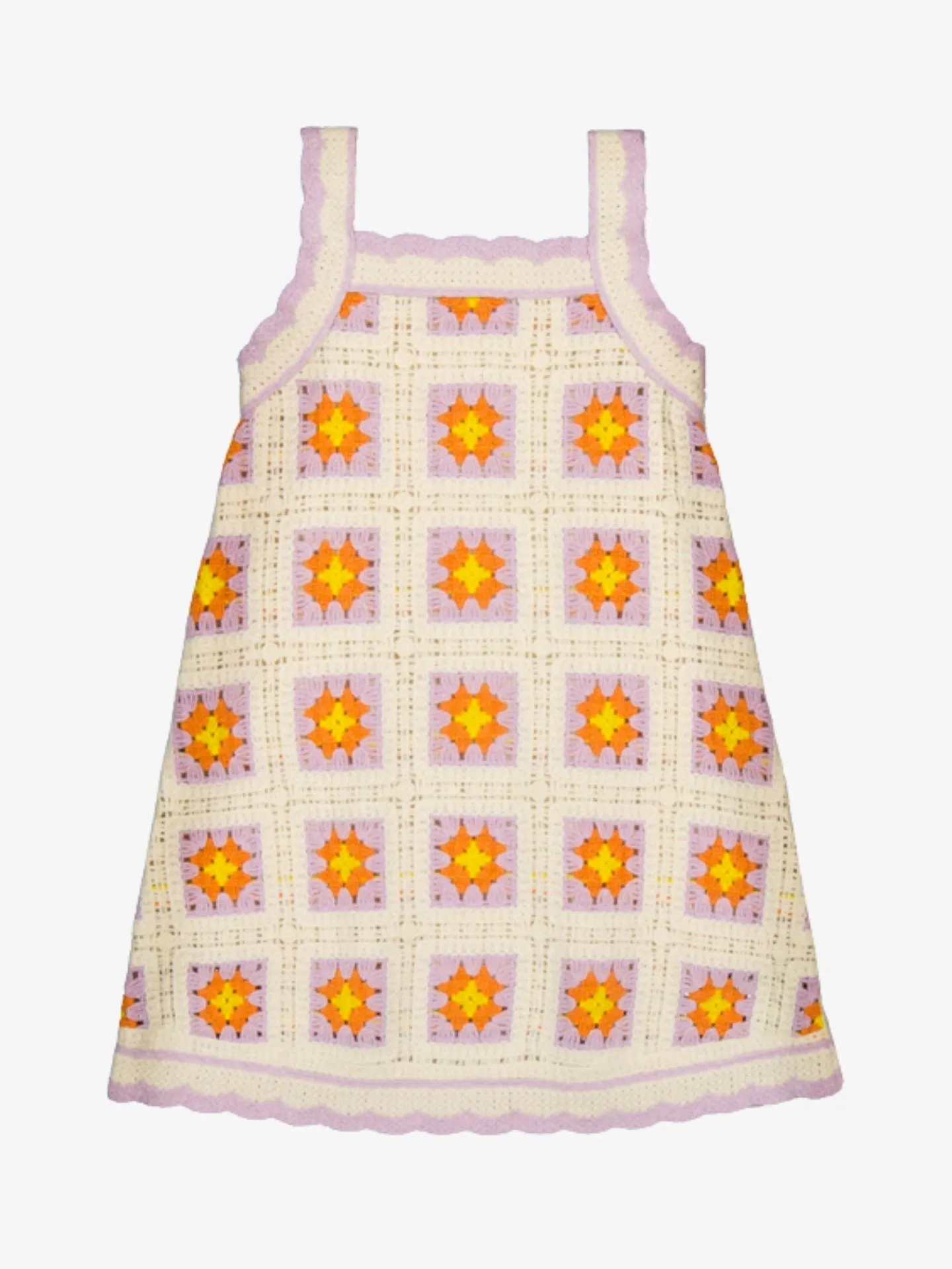 Gehaakte jurk van het Spaanse merk Mayoral. De mouwloze jurk in de kleur Bone creme heeft een fantasie bloemen print is en is afwerkt met lila details.