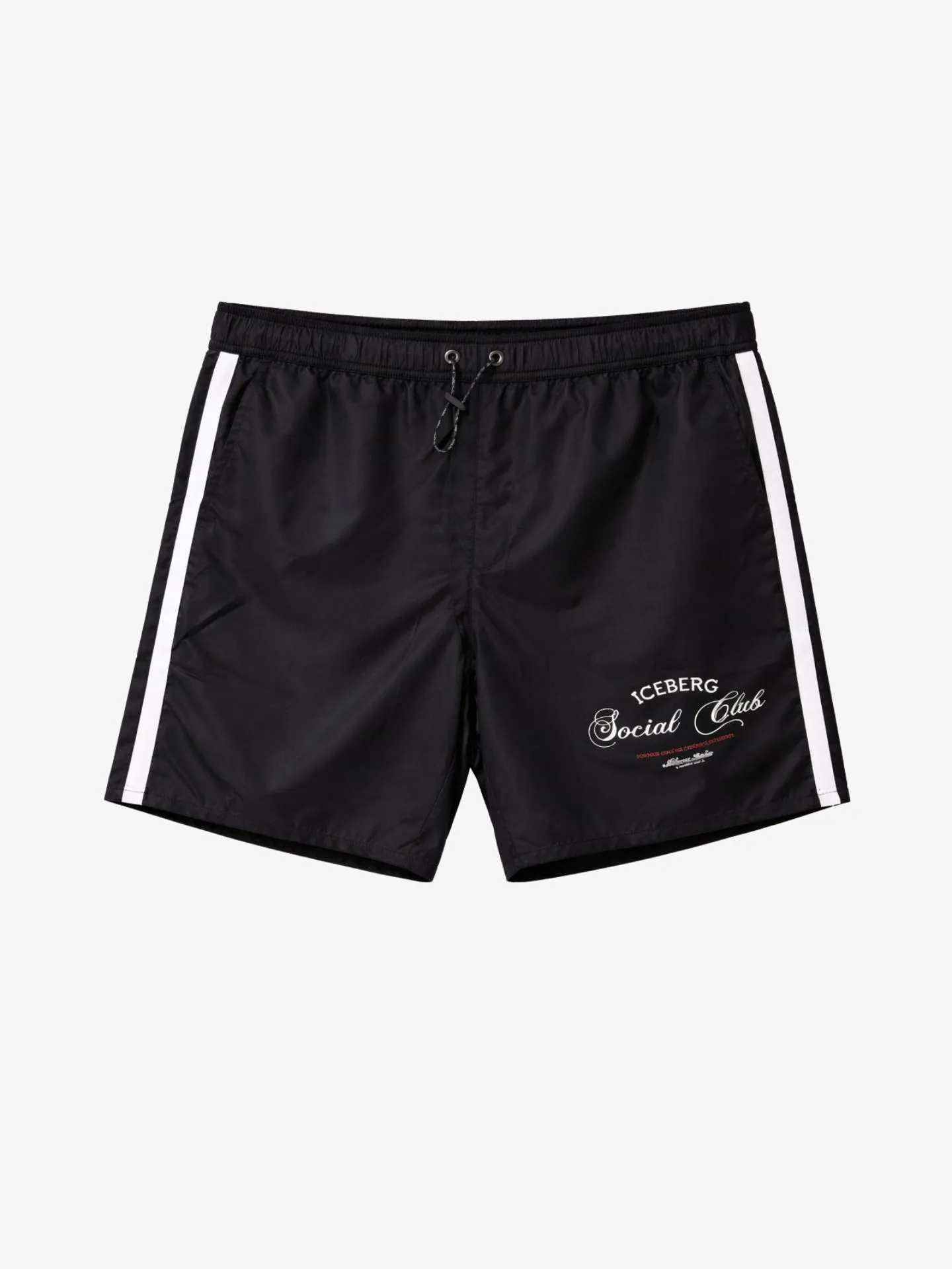 Deze stijlvolle zwarte zwembroek van Iceberg, afkomstig uit de verfijnde "Social Club" collectie, combineert een moderne urban look met een sportieve retro-vibe. Het diepzwarte ontwerp wordt krachtig geaccentueerd door opvallende witte contrast-piping langs de zijpijpen en het elegante witte logo op het linkerbeen, dat met zijn cursieve lettertype en "Milano Italia" branding direct een gevoel van luxe oproept. Dankzij het gebruik van 100% hoogwaardig sneldrogend polyester voelt de short na een duik razendsnel weer droog aan, terwijl de moderne regular fit en de elastische tailleband met contrasterend trekkoord zorgen voor een optimaal draagcomfort en een perfecte pasvorm. Bovendien maken de subtiel weggewerkte ritszakken aan de zijkanten dit item niet alleen ideaal voor in het water, maar ook als modieuze korte broek waarin je je essentials veilig kunt opbergen tijdens een bezoek aan de strandbar.