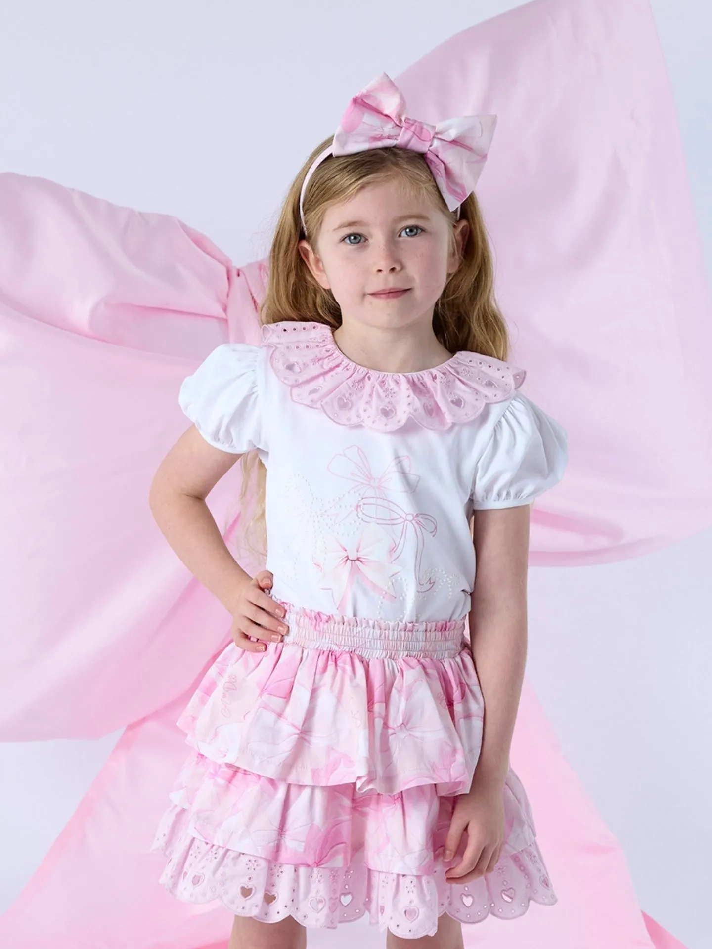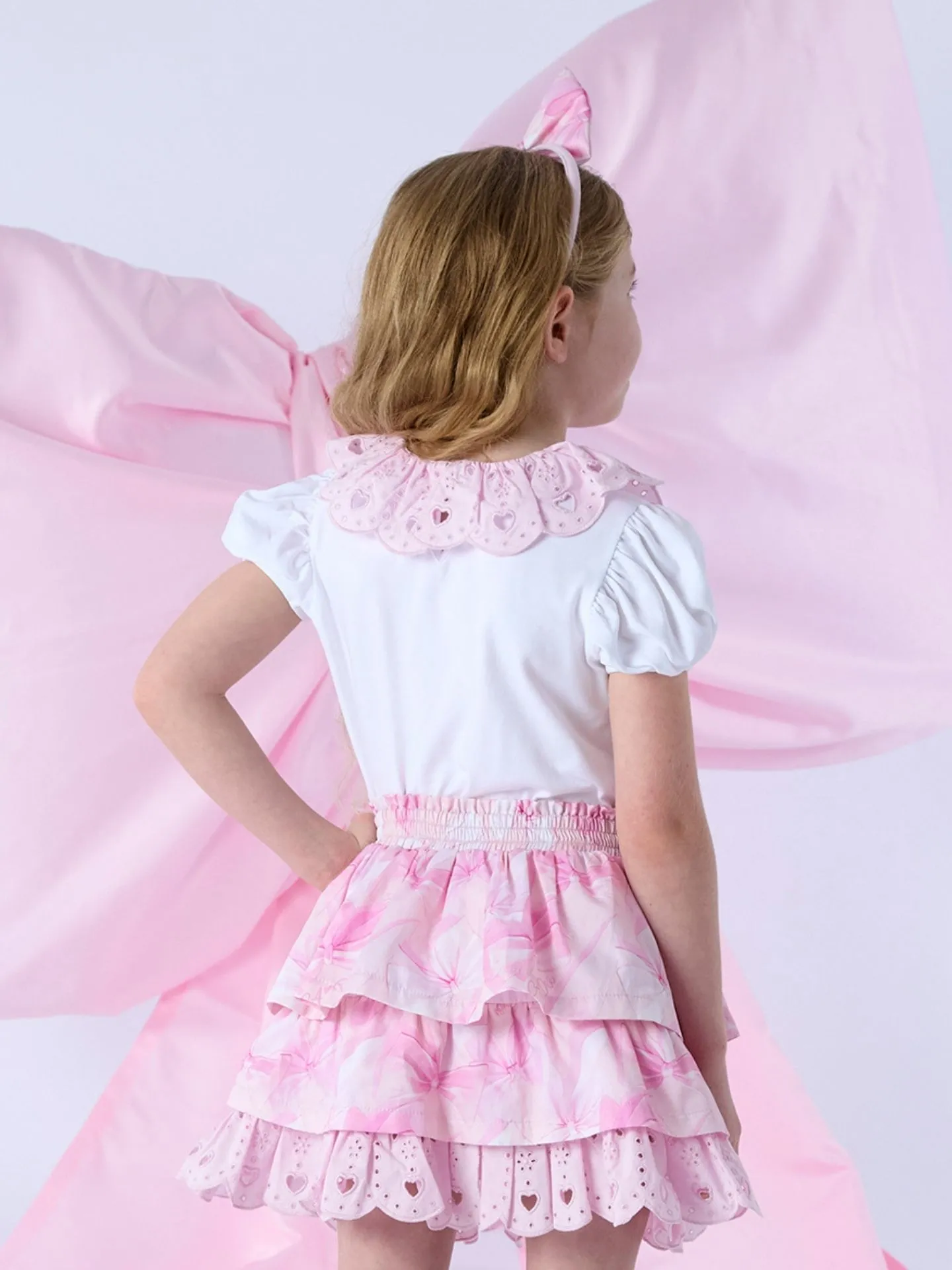De Riri rokset bestaat uit een witte of roze jersey top met een prachtig strikdesign, strass-steentjes en pofmouwen. De rok met ruches is gemaakt van bijpassende poplin met strikprint en heeft een elastische tailleband voor een comfortabele pasvorm.