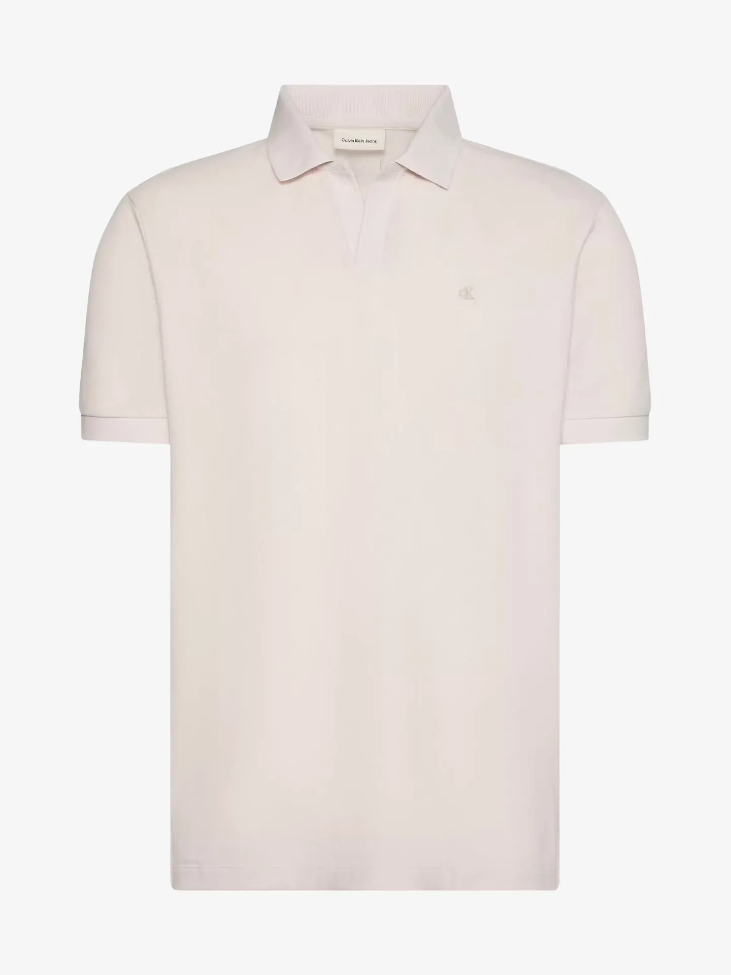 Polo met open kraag van het Amerikaanse merk Calvin Klein. De polo in de kleur White Sand heeft korte mouwen, open kraag en een klein logo aan de voorzijde.